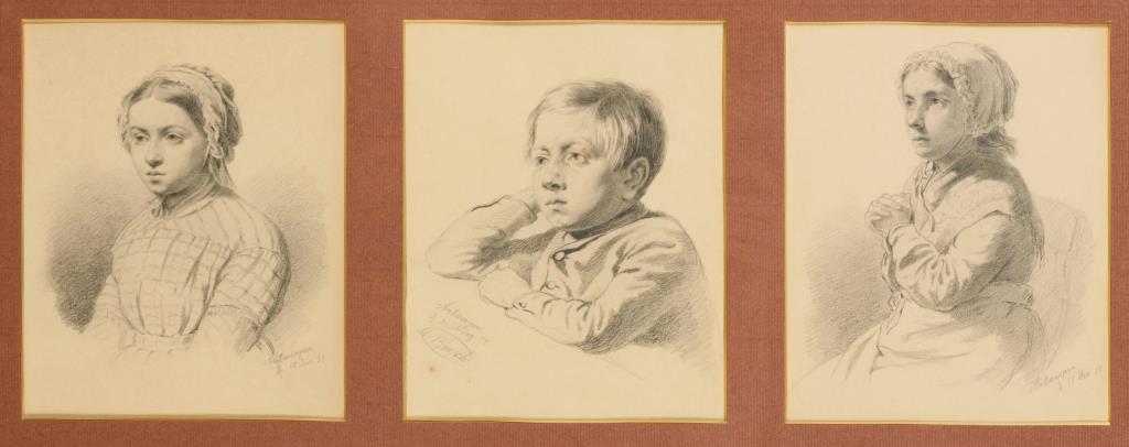 Biedermeier-Bildnisse von 2 Mädchen und 1 Jungen in 1 Rahmen. Minimal stockfleckig.