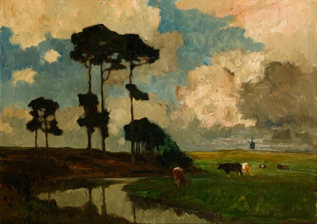 Tiere auf der Weide in der weiten, flachen Landschaft mit Mühle am Horizont. Einen sehr kleine restaurierte Stelle mit Hinterklebung.