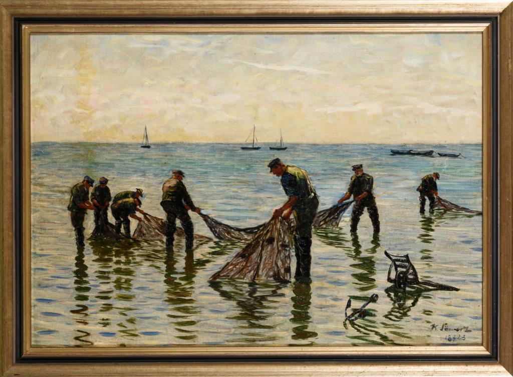 Die Fischer beim Einholen der Netze im seichten Meerwasser. Restauriert.
