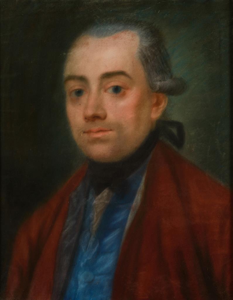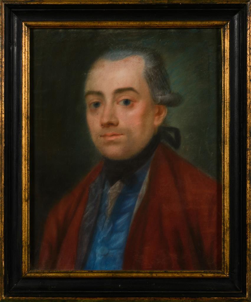Bildnis eines jungen Mannes mit grauer Zopfperücke und roter Jacke.