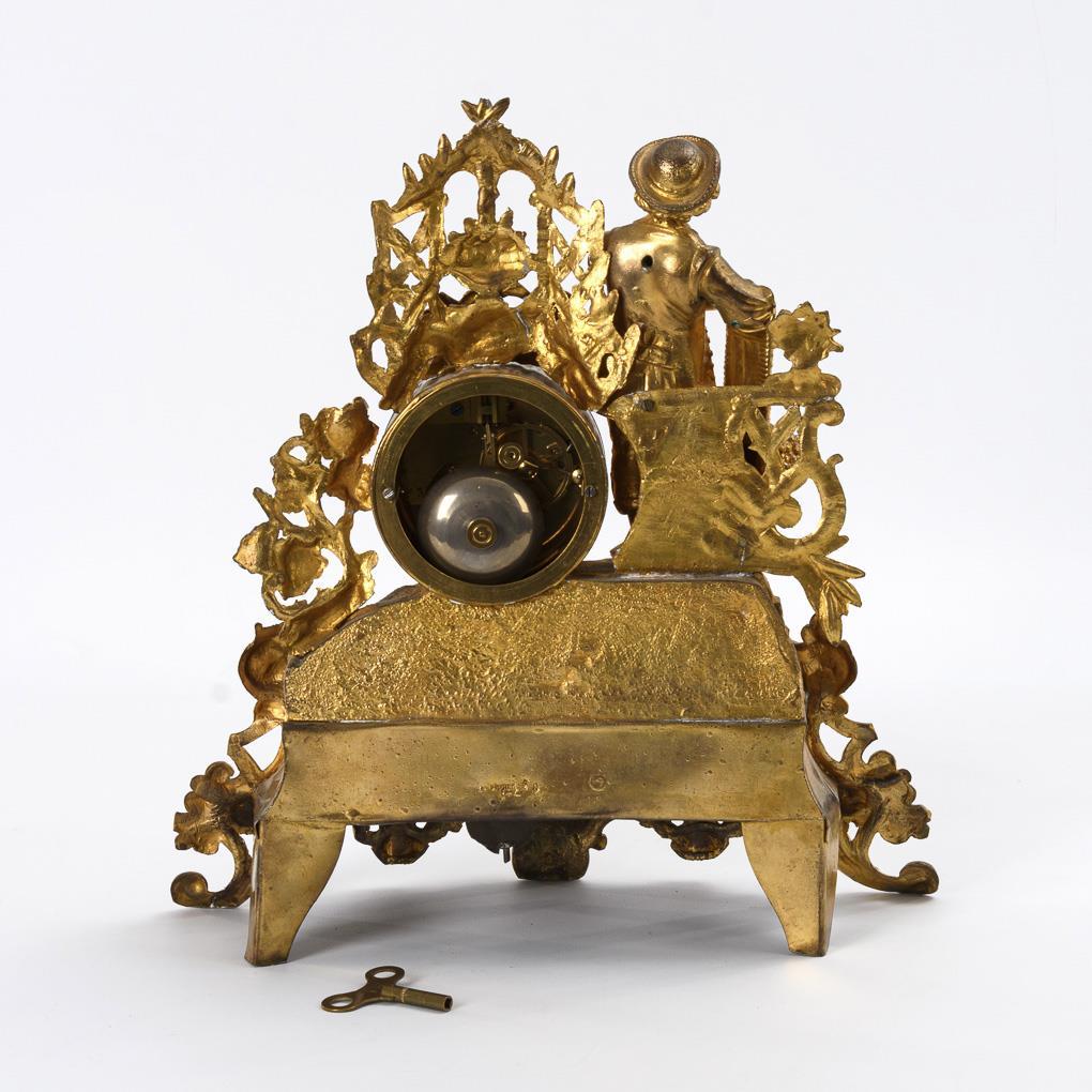 Baroque-style natural base, partly pierced, with the crowning figure of a young winemaker with a pannier, grapes and autumn symbolism. Additions (dial, hands, movement), rubbing, traces of soldering, defects.