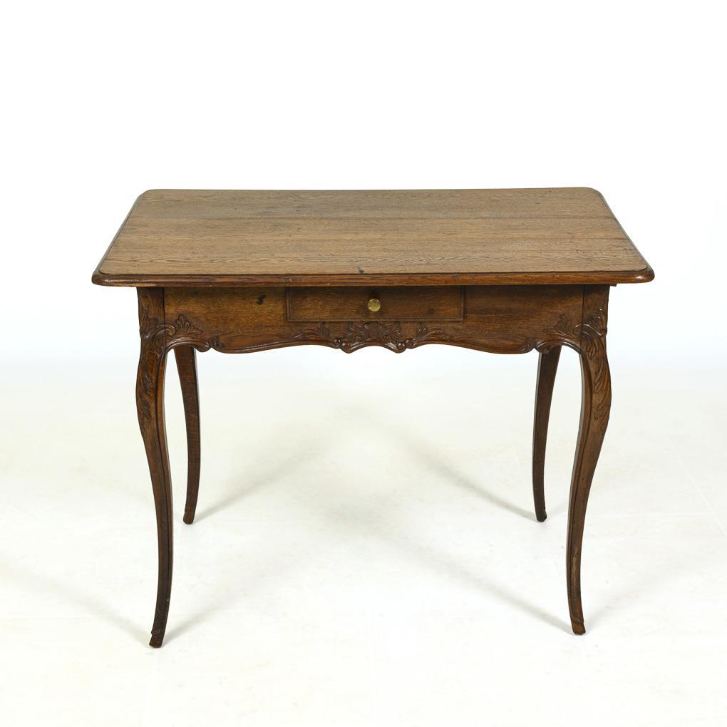 Simple salon table with curved frame and small frame drawer, on 4 slightly flared legs; discreetly decorated with vegetal relief carving. Restored, slight signs of age / use.