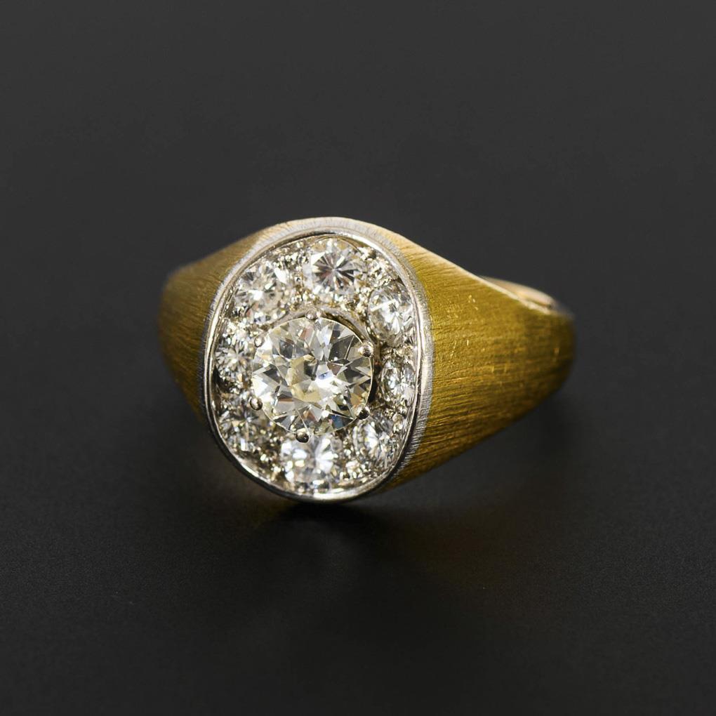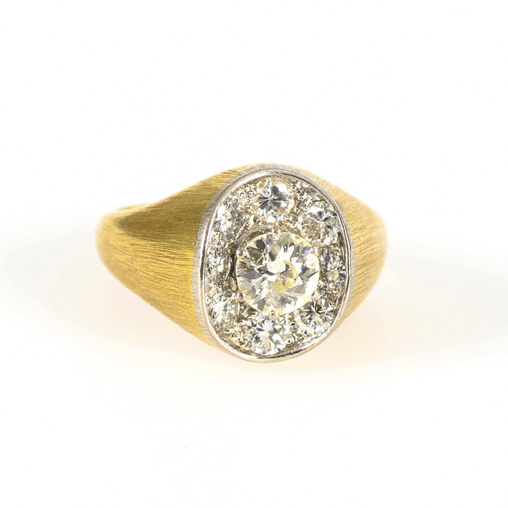 Yellow gold/white gold 750 stamped. Master hallmark uninterpreted. Old-cut diamond circa 1935 approx. 1.00 ct/white-weakly tinted white/Si. 2 brilliant-cut diamonds each approx. 0.18 ct. 6 brilliant-cut diamonds each approx. 0.15 ct. 10.5 g.