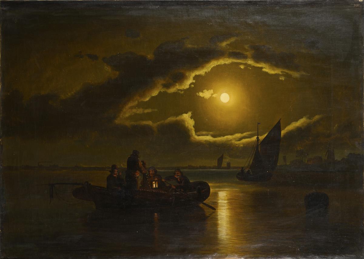 In the foreground a fisherman in the light of the lantern on the rowing boat with view over the partly reflecting water to the sailors off the coast in the warm-toned light of the moon.