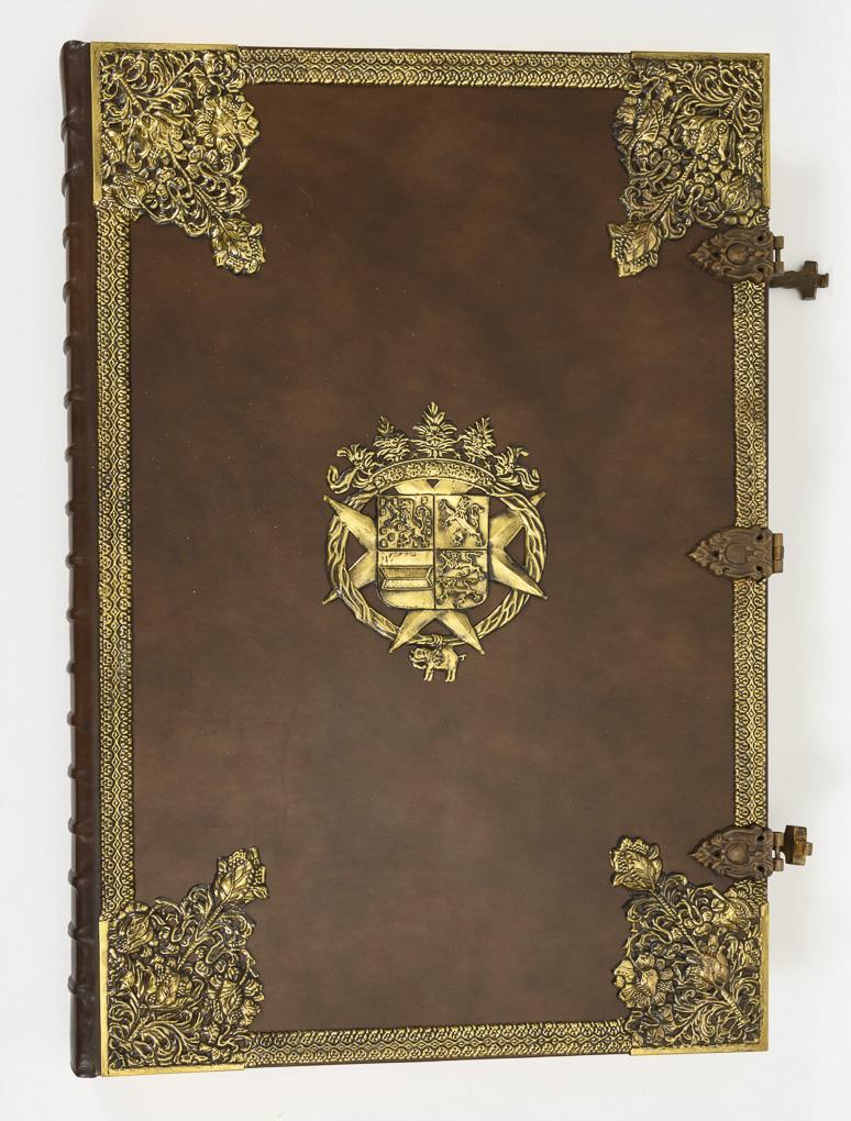 Very large format book of the reduced facsimile edition of the original located in the German State Library in Berlin. Numbered copy 374/750. full leather binding on real frets, with metal applications, coats of arms and clasps. Plus commentary volume in slipcase, in German, Latin, English, French and Dutch (32.5 x 25 cm) .