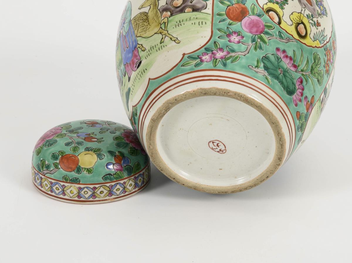 Lidded vase with green background.