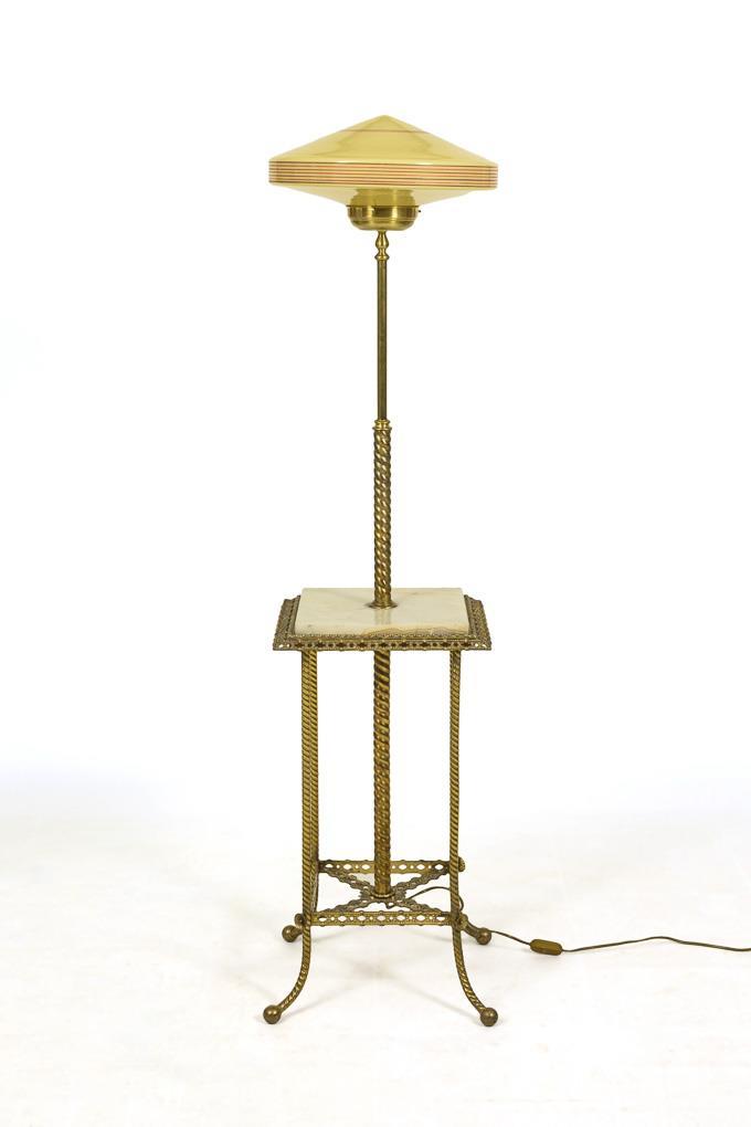 1-light floor lamp on twisted brass strut, centered by small side table with light alabaster top and brass frame with à jour worked trim, conical glass shade of champagne-colored overlaid opal glass with purple and red stripe decor. Slight signs of age/use, slight traces of corrosion, glass rim with small chips and rubbed painting.
