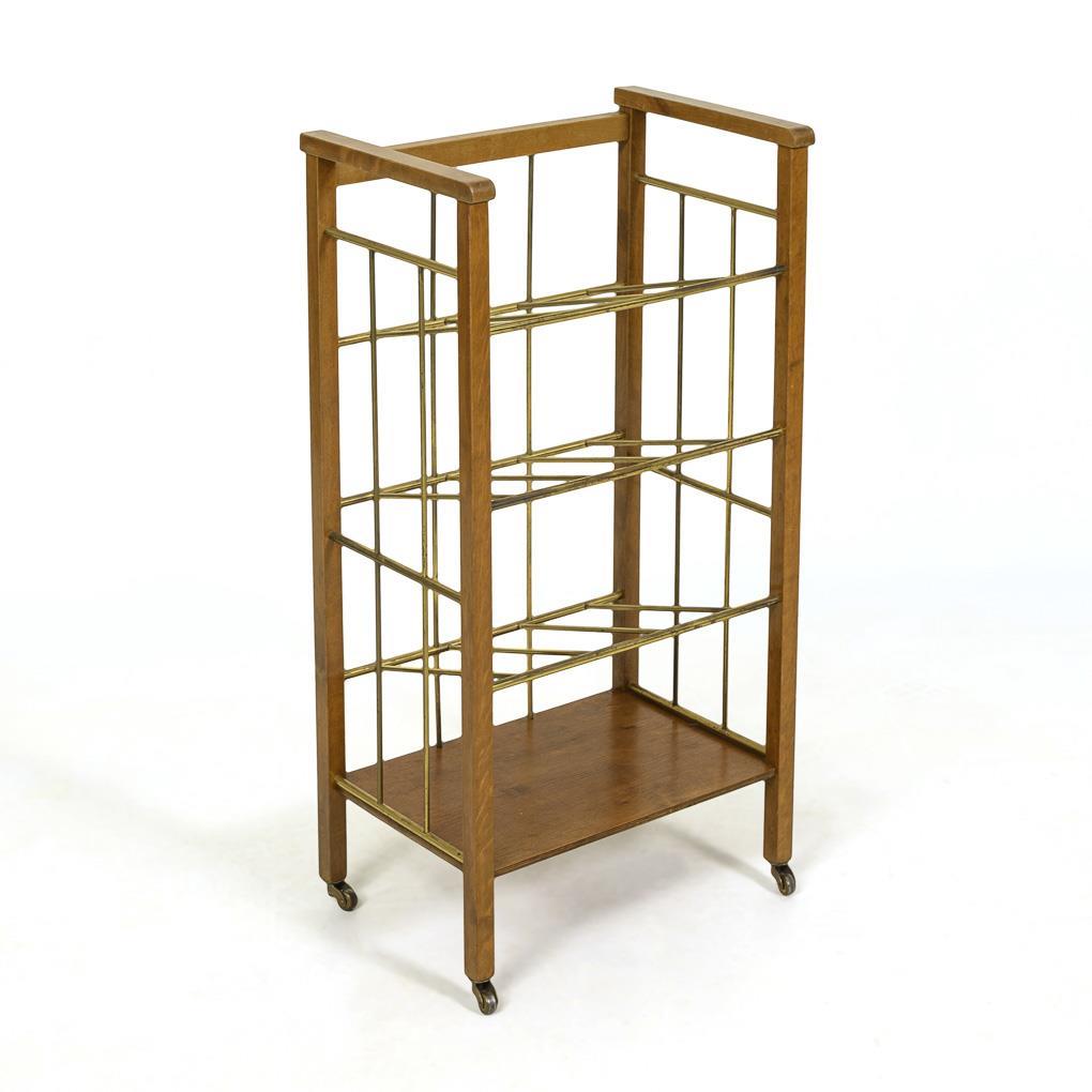 Wheeled, handy newspaper trolley with 3 brass braced shelves and 1 shelf. Slight signs of age/use, brass with signs of corrosion.