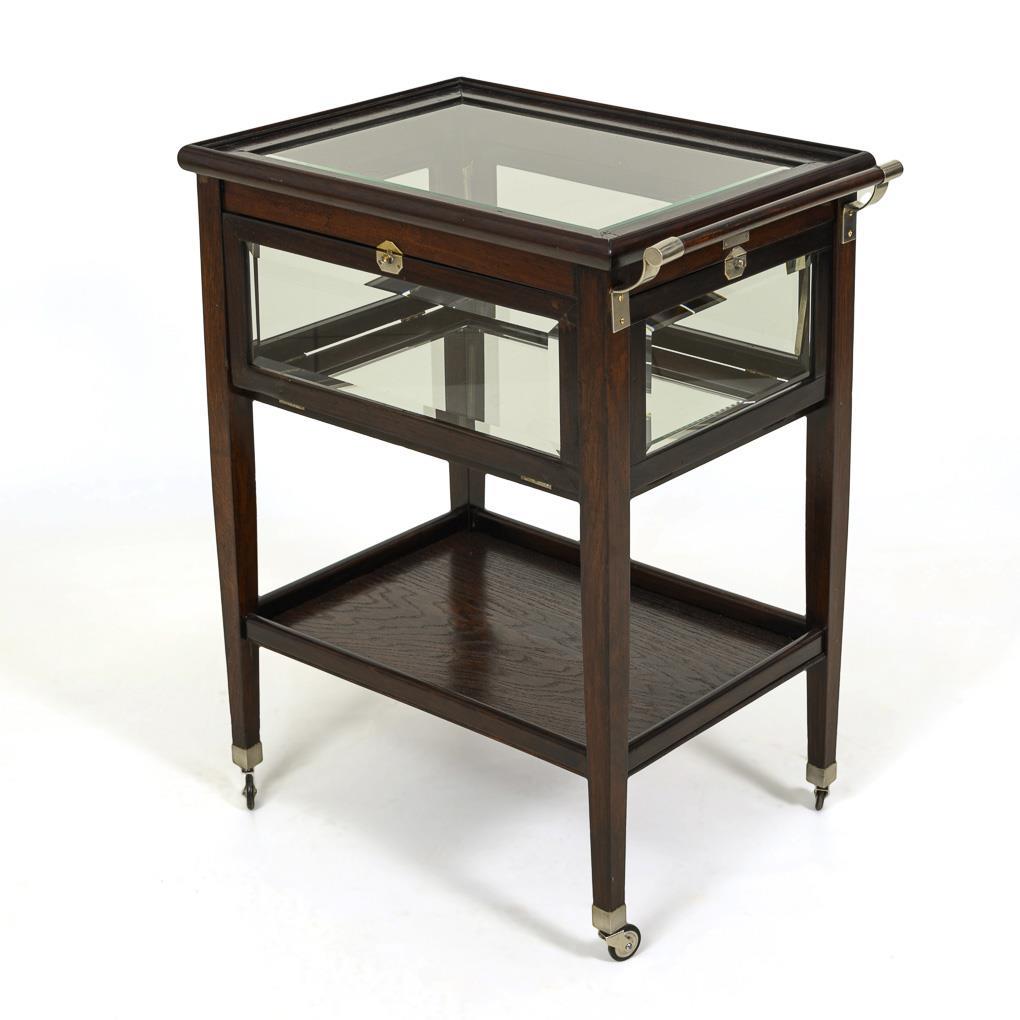 Wheeled tea trolley with plain rectangular wooden frame and handle on the short side, upper part with closed body faceted-glazed on all sides with 4 hinged flaps, lower part with open shelf. Restored ready to live, minimal traces of use.
