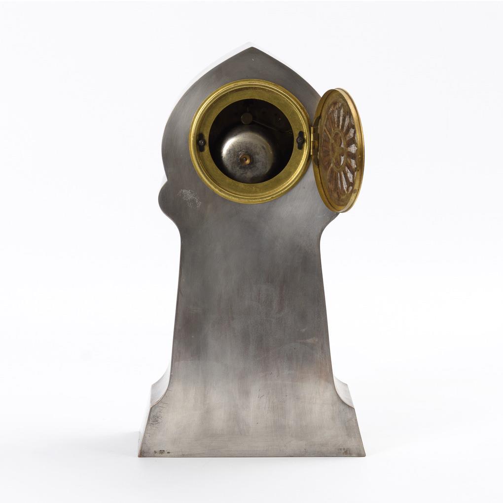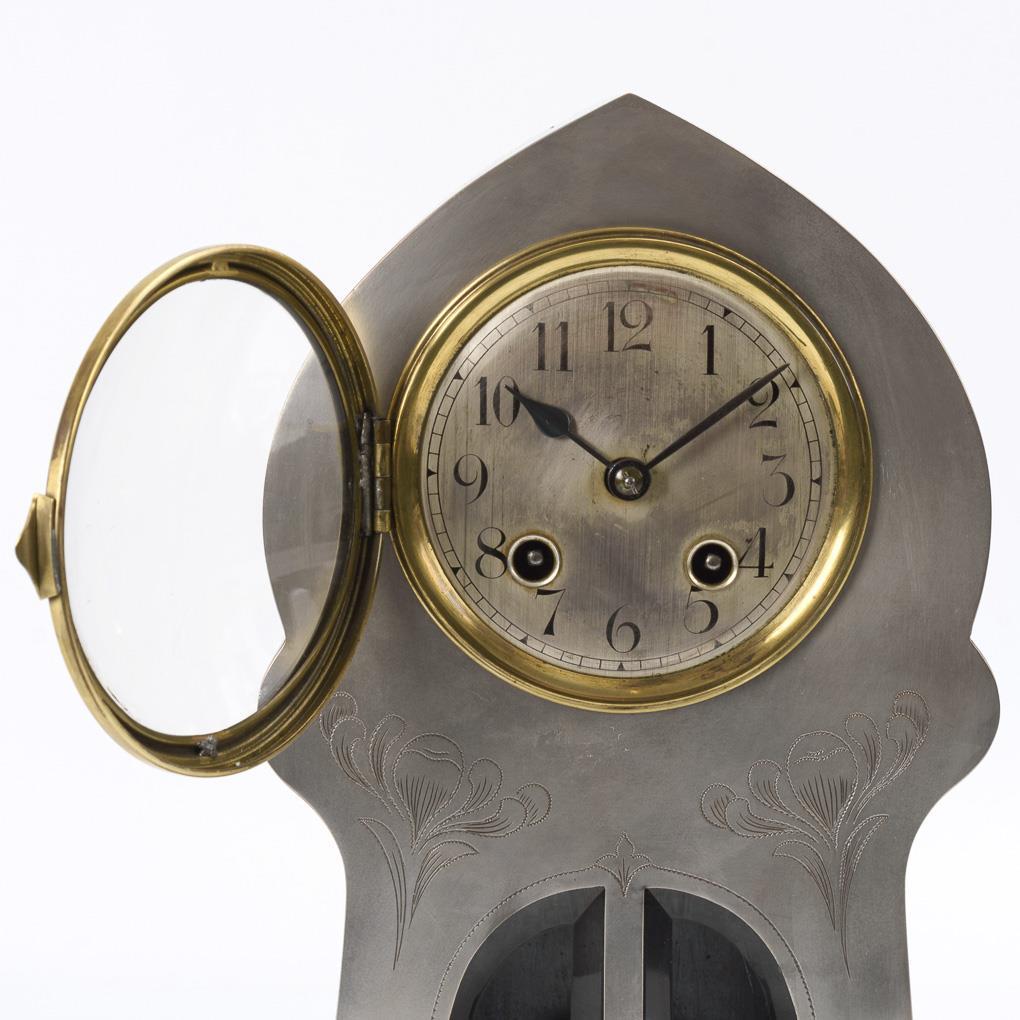 Movement with half-hour strike on bell, starts. Glazed dial with Arabic numerals, minute ring and spade hands.