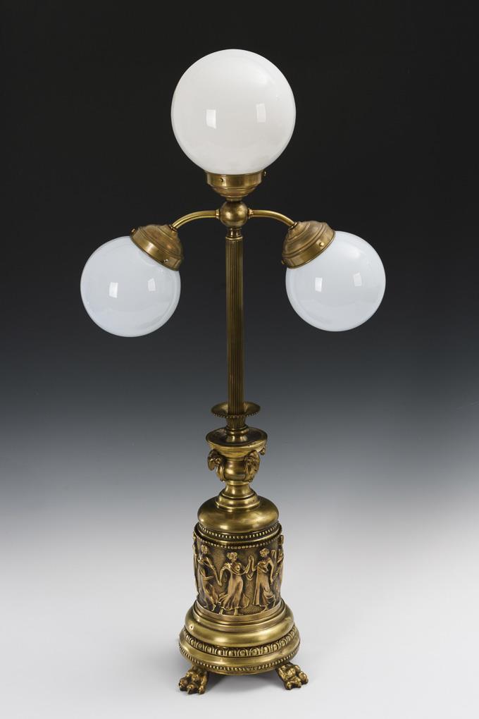 Pedestal resting on 4 paw feet with surrounding relief frieze: dancing women. Vase with rams heads as a base for the fluted column shaft and screw sockets in the spherical glass shades. Functioning, younger wired. 1 crack in the sheet metal, otherwise little signs of age / use.