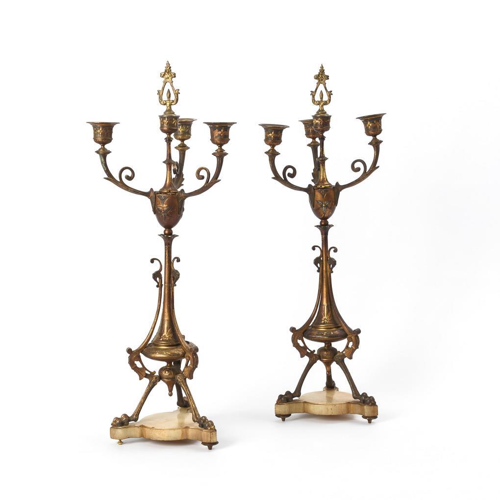 Alabaster plinth, 3 struts with paw legs on strongly whorled shaft, 3 arms on a vase as well as central spout with extinguishing plug. Arms partly slightly bent, missing decorative appliques not noticeable, 1 stand replaced, signs of age/use.