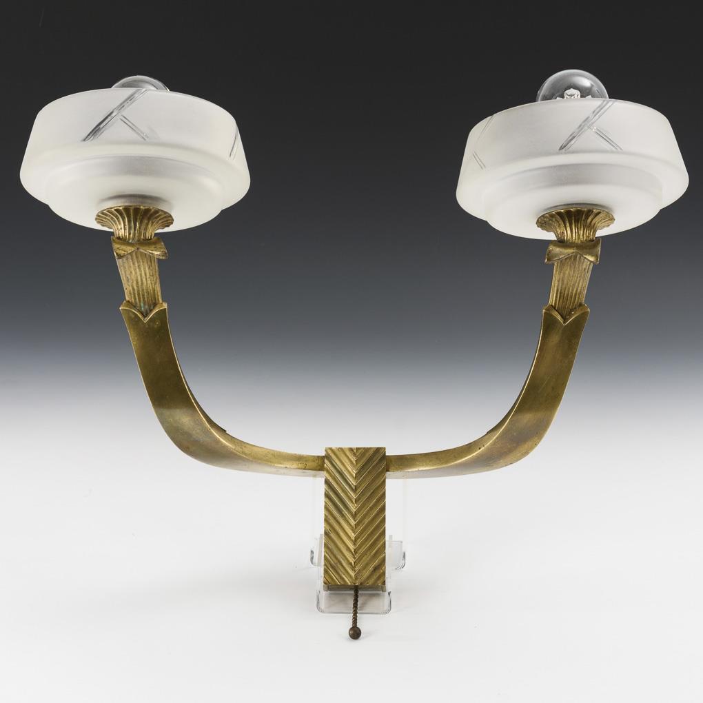 2-light wall lamp on horseshoe-shaped curved frame with stylized palmettes, satin-finished applied glass bowls with discreet notch decoration. Signs of age/use, metal with traces of corrosion.