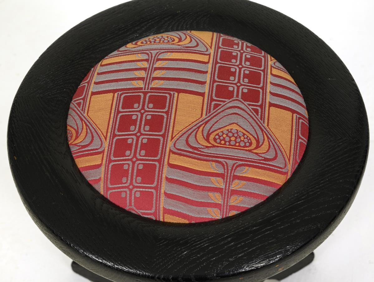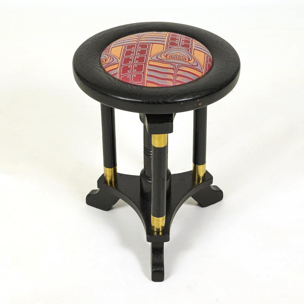 Round stool on 3-pass shaped frame with central support, 3 columns with brass sheet applications and slightly flared feet, with height-adjustable seat by coil spring, style-typical cover. Restored ready for living.