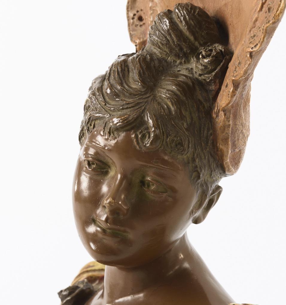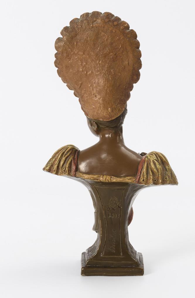 Contemporary molding of an elegant lady with striking headdress in the form of peacock feathers. Partially minimally bumped and rubbed.