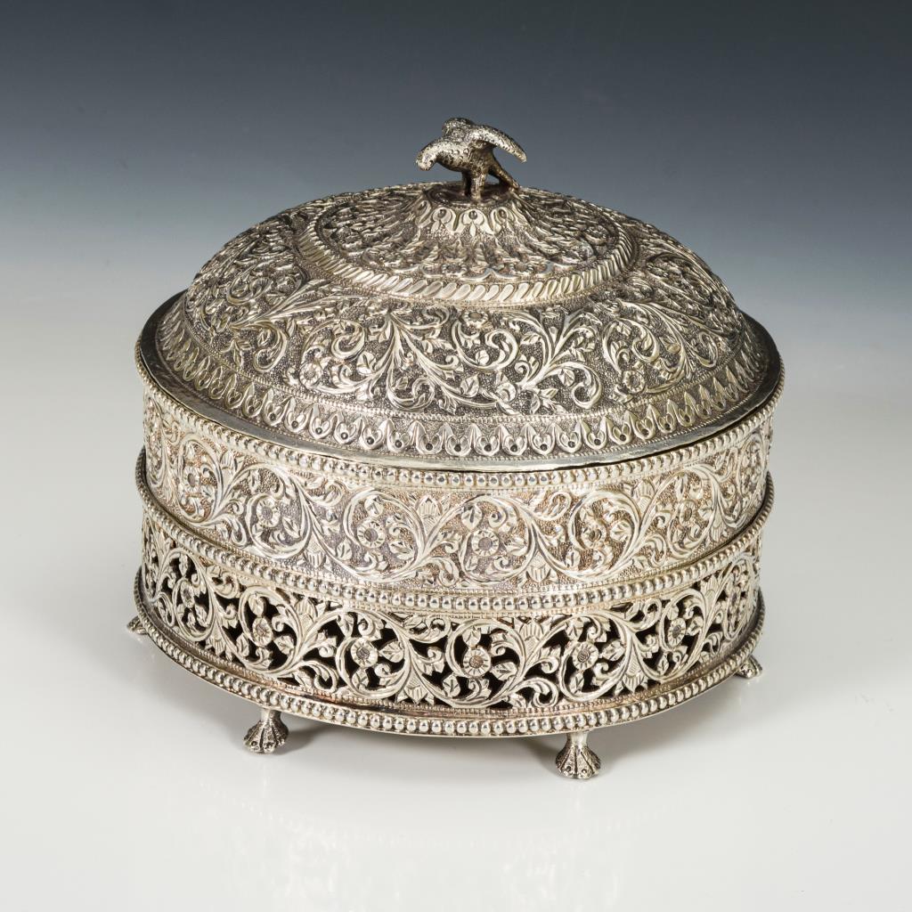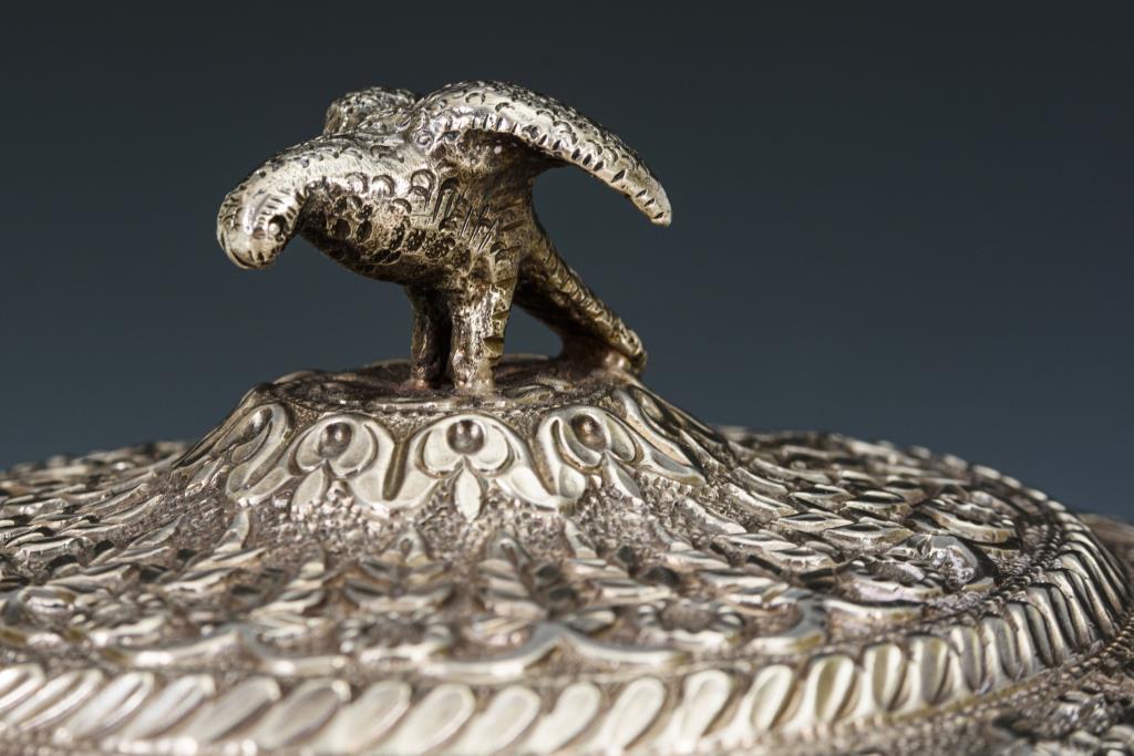 Rundes Deckelgefäß mit Floralrelief und Adlerknauf. Einsatz mit 7 kleinen Fächern. Füßchen mit Lötstellen.