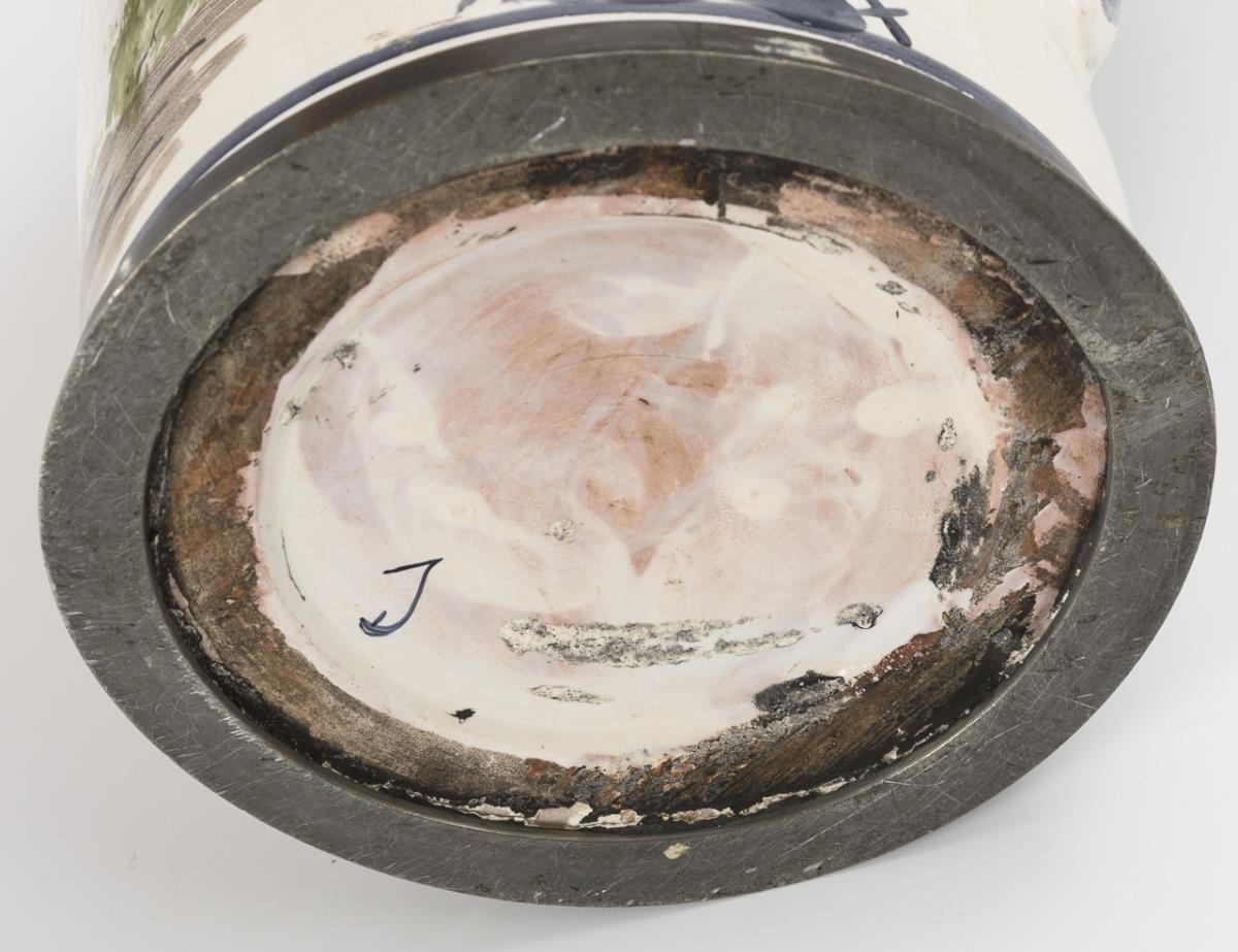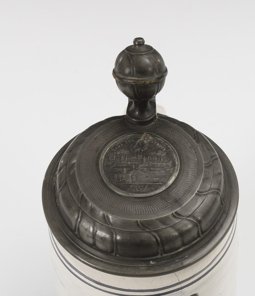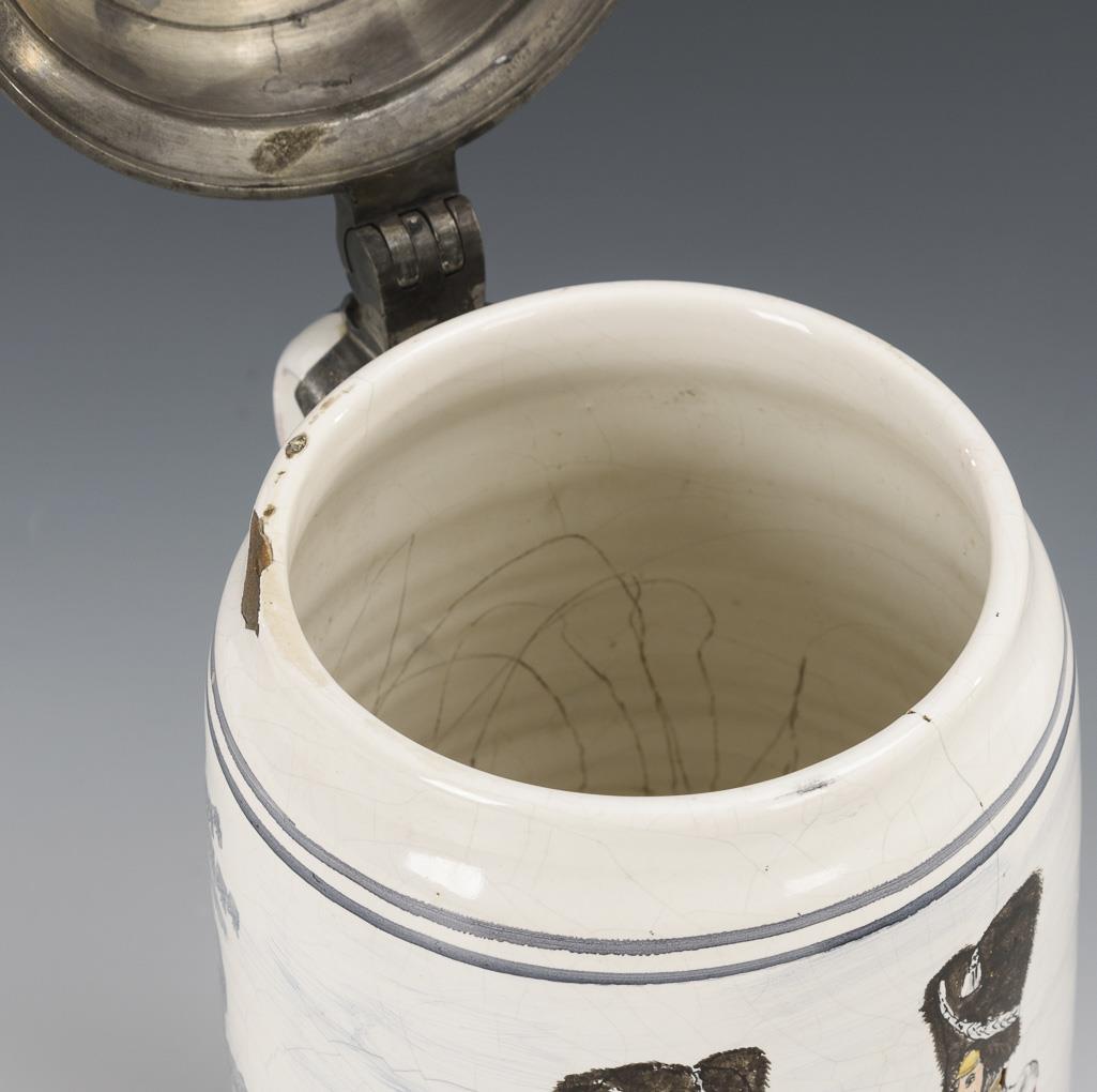 Cylindrical jug with leaf decorated ribbon handle. On the front 2 elite soldiers with sabers and musket and bayonet in sketched landscape. Profiled pewter lid with ball pusher and relief Regensburg plaque ("Tali sub custodia"), indistinctly hallmarked inside, pewter stand ring. handle and muzzle partially cracked, glaze cracked, partially bumped.
