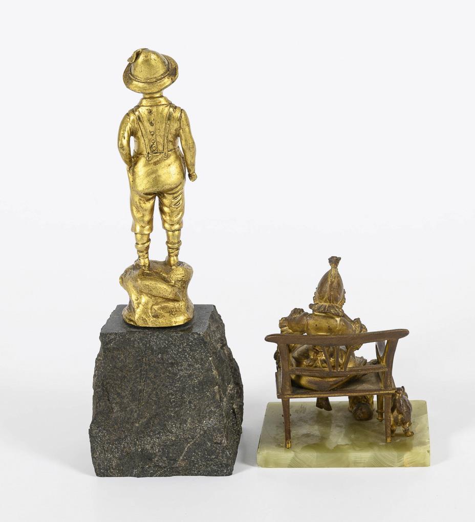 Gold-colored bronze, stone base and onyx marble, respectively. H 11,5 / 12,5 and 16 / 24 cm respectively.