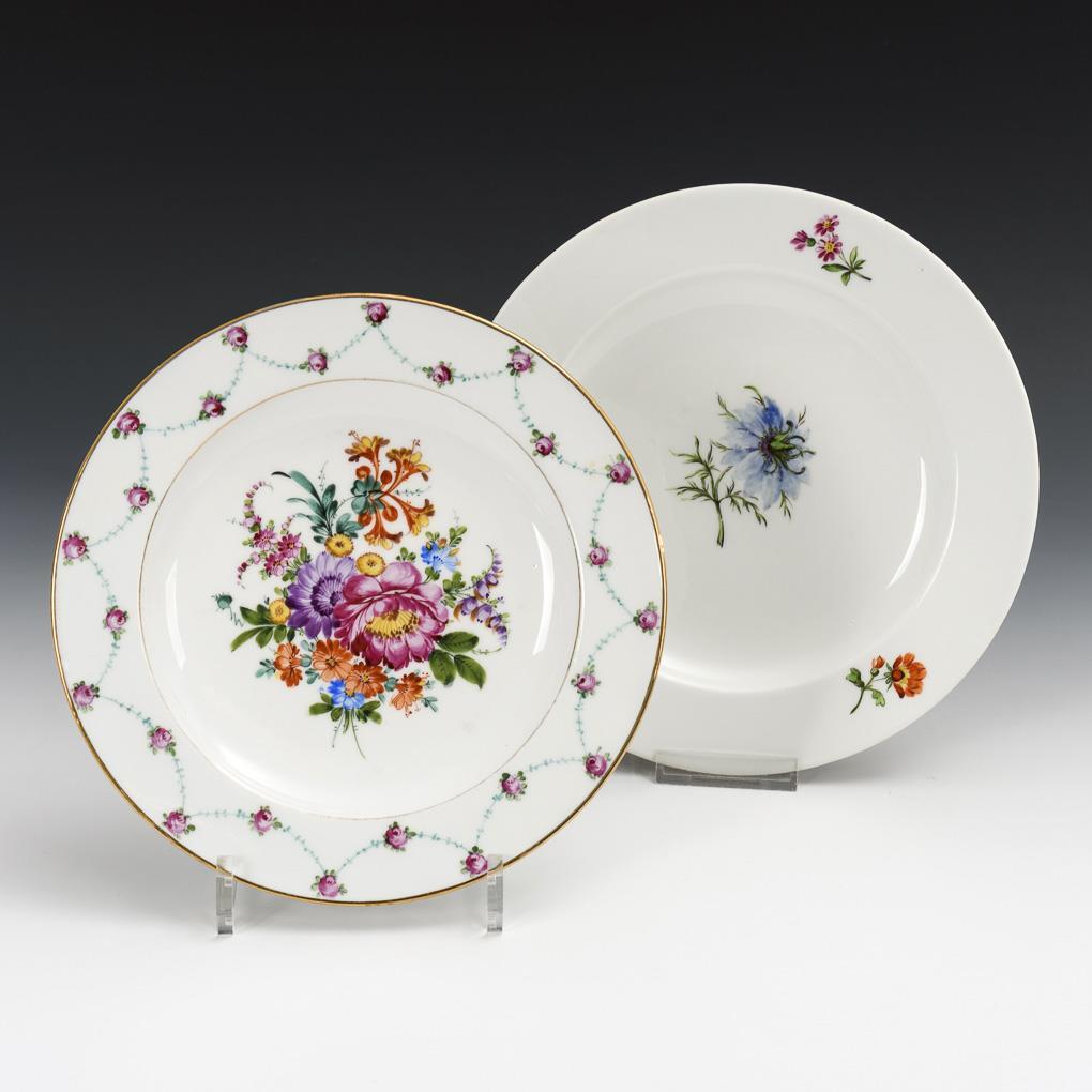 1x sword mark with star, Marcolini period, 1774-1814: dinner plate in smooth form with a cornflower in the mirror (Ø 25 cm). / 1x Sword mark 1934-1945, 1 grinding stroke: dinner plate with rose festoons on the flag as well as a bouquet of flowers in the mirror (Ø 23,5 cm). 1x with ground out ash dots and bumping on the stand ring.