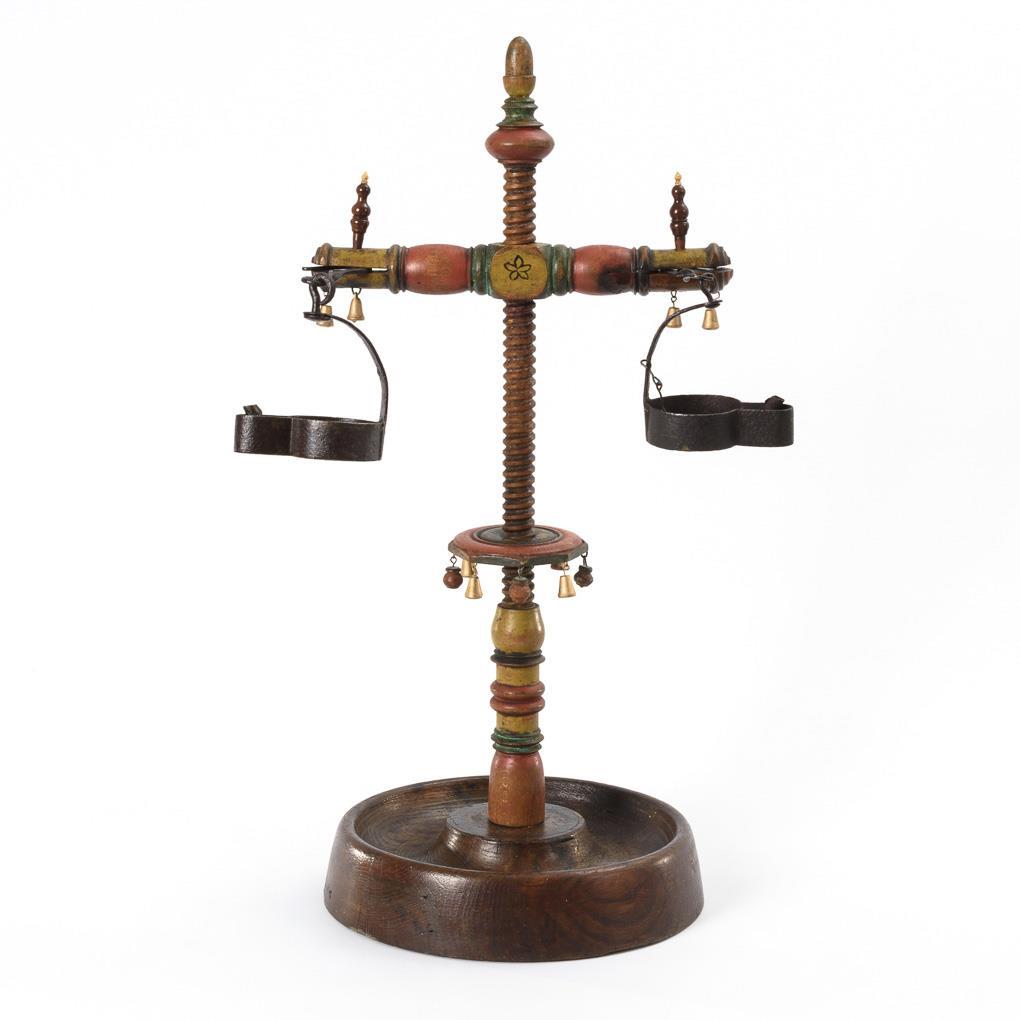 Bowl-shaped round base, turned shaft with turning hinge to adjust the height of the hand guard and the cross arm with slot holders for the open frog lamps. Some attached Drechsel-Zierappliken as well as Zapfenbekrönung .Professionally restored (foot glued, 1 slot holder half supplemented). 1 wick chain missing. A few signs of age / use.