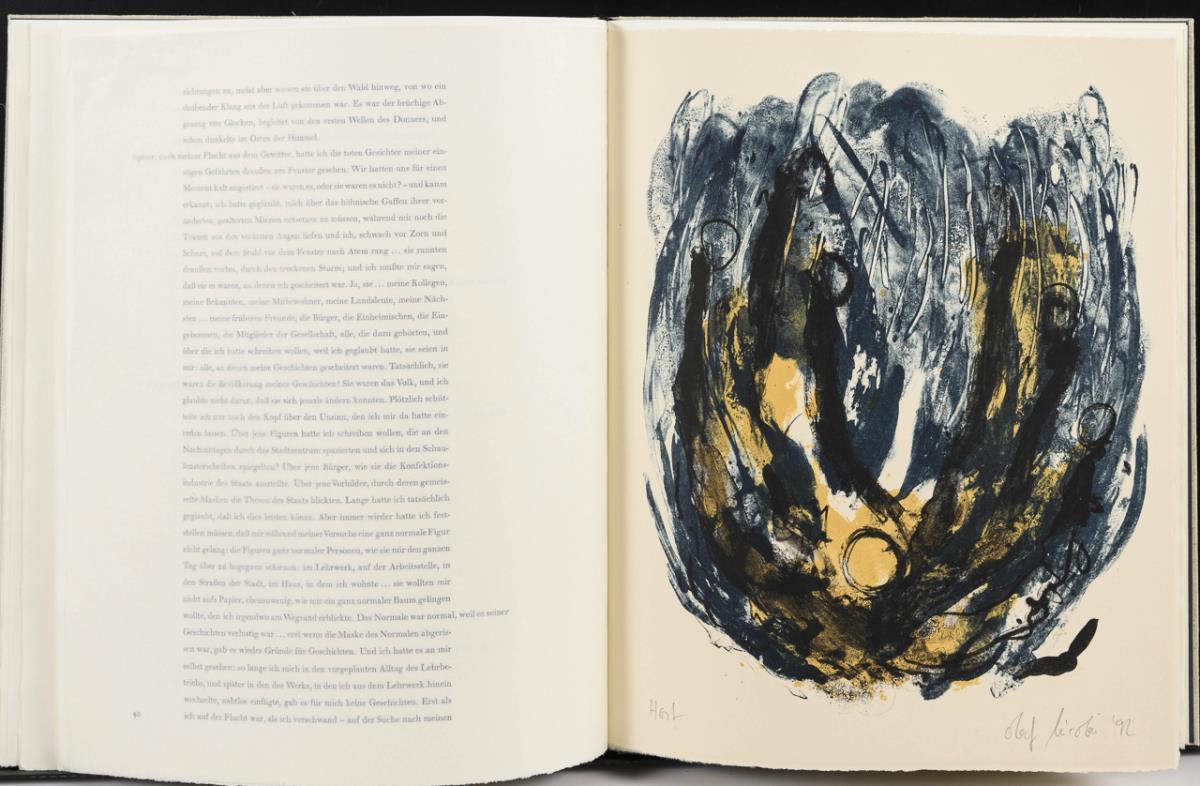 Complete artist's book in original slipcase with 6 color lithographs by Olaf Nicolai; 7th printing by Sisyphos-Presse, Faber and Faber, Berlin 1992. Slipcase with minimal bumping.
