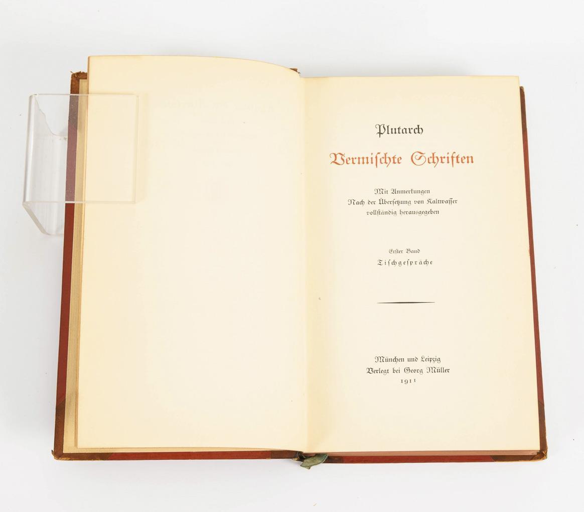 With notes after the translation by Kaltwasser, edited by Dr. Hannes Floerke. / "Vermischte Schriften" Volumes 1 and 3 present. All in the same half leather binding. Spine somewhat stained, binding faintly rubbed, otherwise good condition.