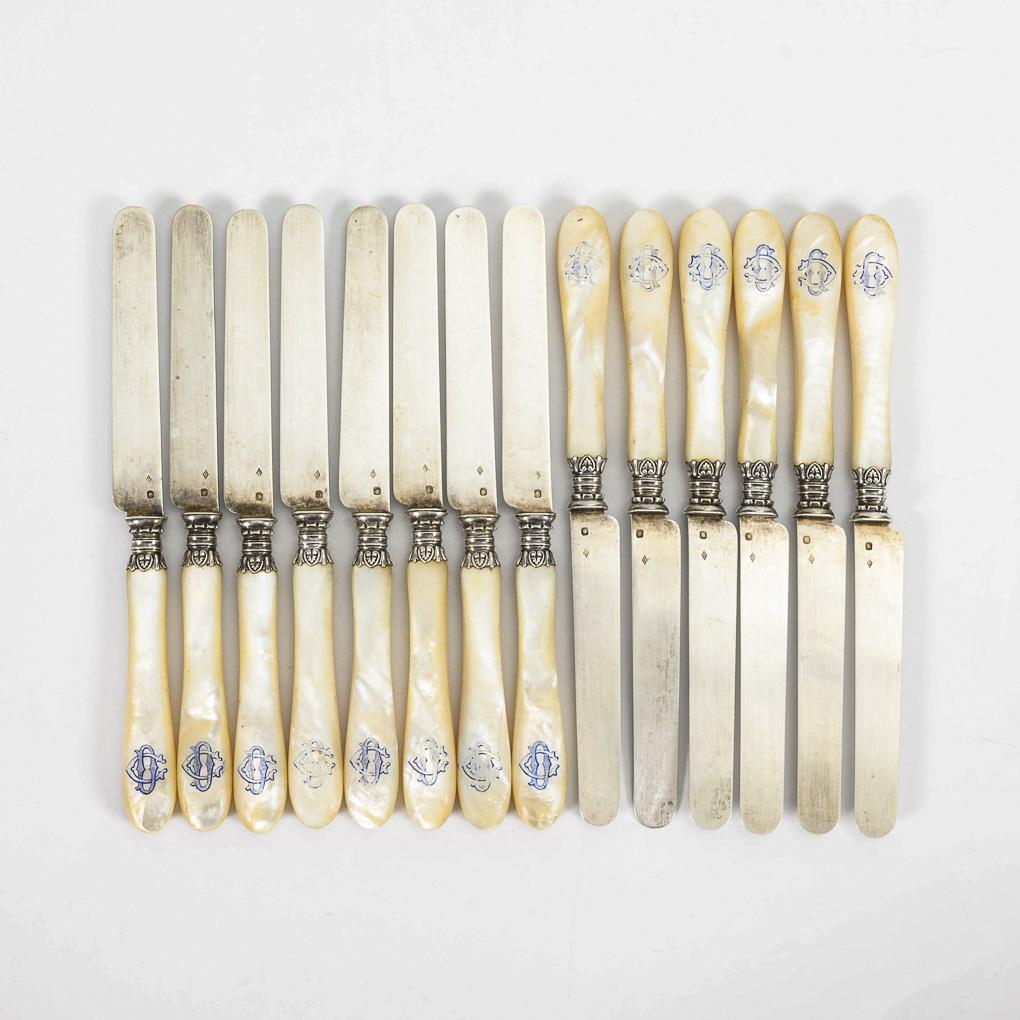 14 French fruit knives with mother of pearl handles in case.