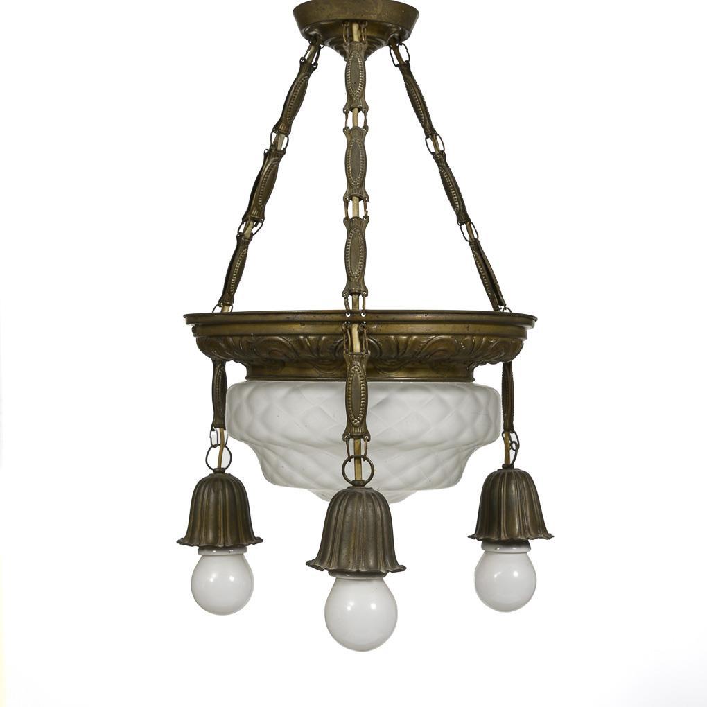 4-light hanging lamp on 3-fold chain suspension with plate canopy, hollow-formed brass ring with hanging bell sockets; drop-shaped glass shade of satin pressed glass. Traces of age/use, metal with traces of corrosion, chains with defects, glass rim with chips.