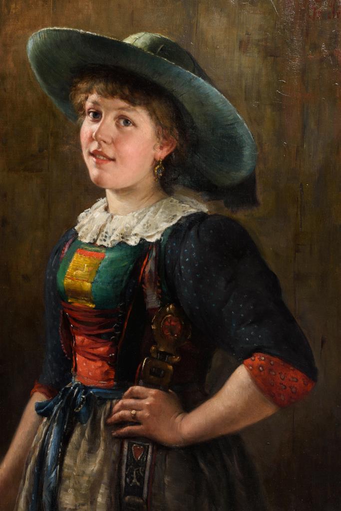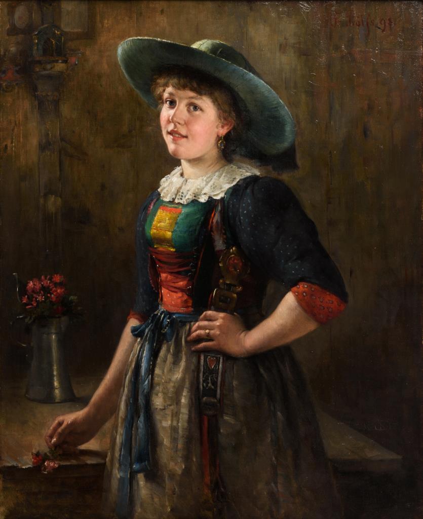 Porträt einer jungen Frau in alpenländischer Tracht an einem Tisch im hellen Licht. Minimale Altersspuren.