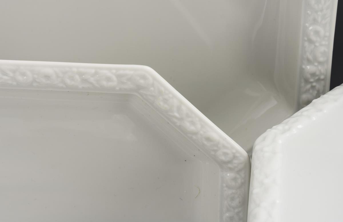 28 pieces. 6 soup plates, 6 dinner plates, 6 salad plates, 3 bowls (Ø 21.5, 24.5 and 27.5 cm), 3 plates (L 28, 32.5 and 37.5 cm), 2 tureens (H 21 cm), 1 lidded bowl (H 14 cm) and 1 sauce boat (L 25 cm). 1 dinner plate with hairline crack, 1 soup plate with 2 bumps.