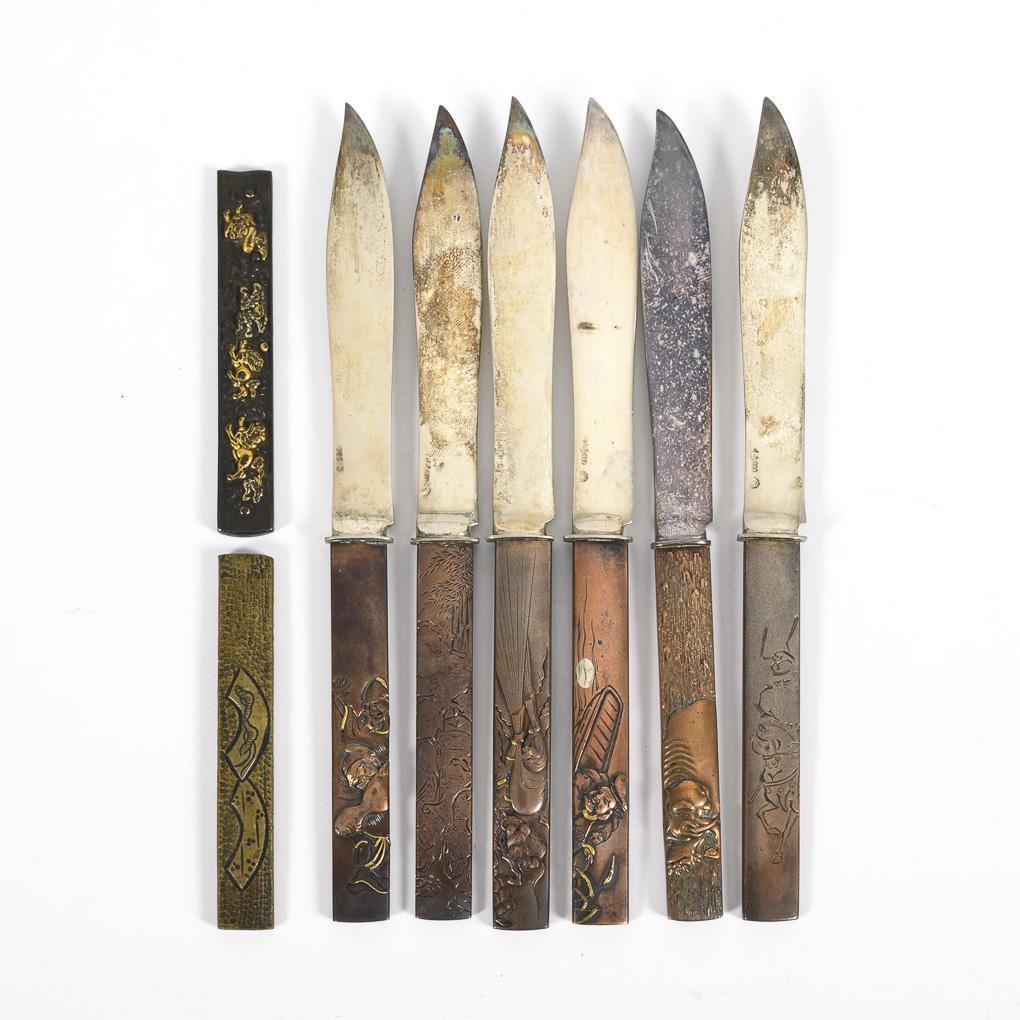 6 knives with silver blades and 2 knife sleeves.