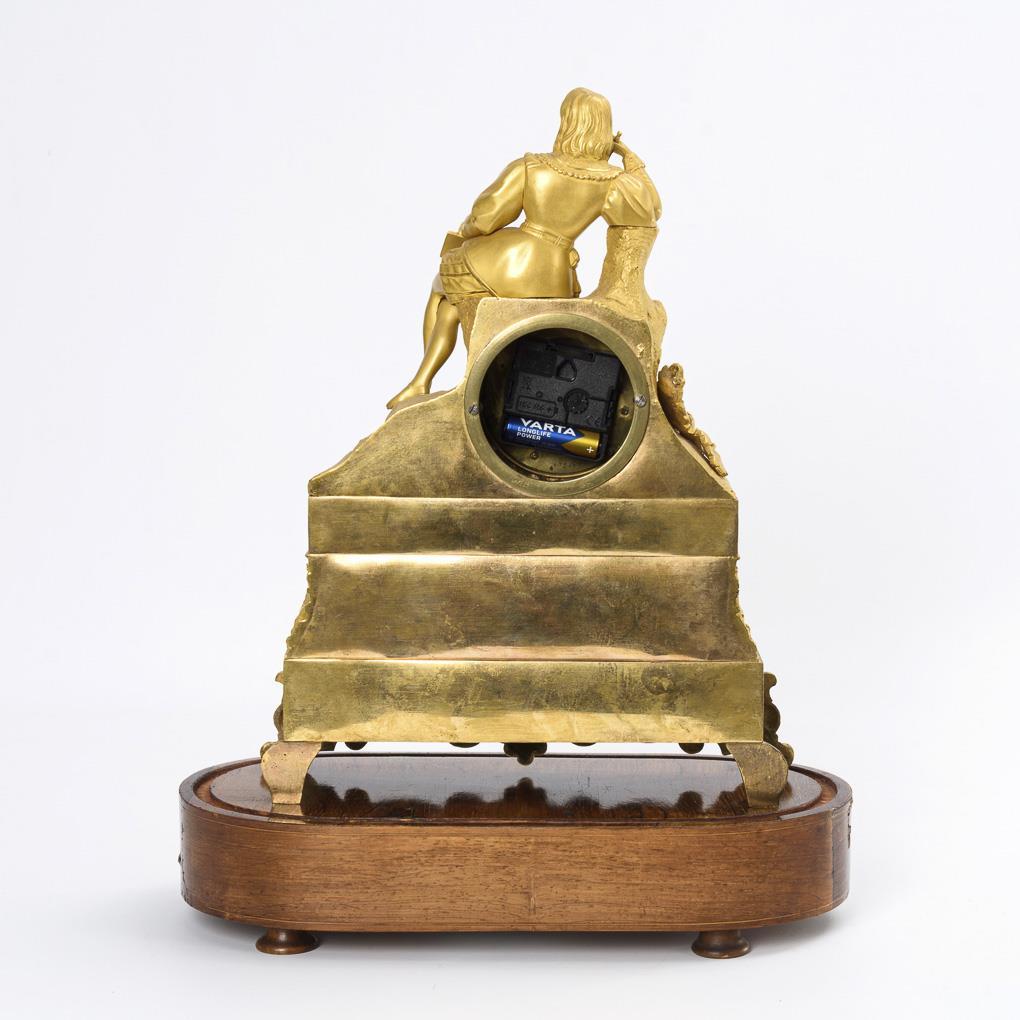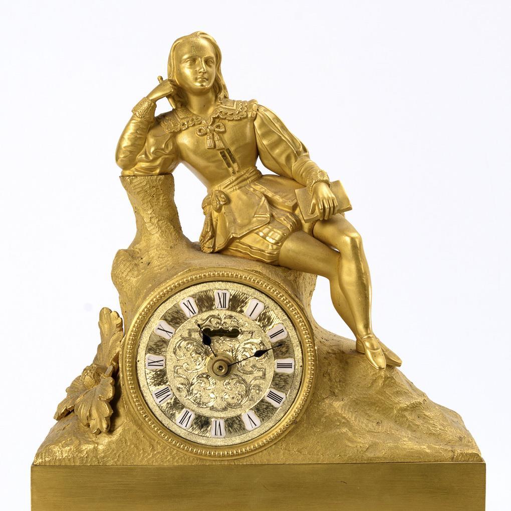 Figure pendulum in baroque style with high base and crowning nature piece with pondering poet and clock drum. In addition, an oval rosewood base with floral inlays. Slight signs of age, partial defects.