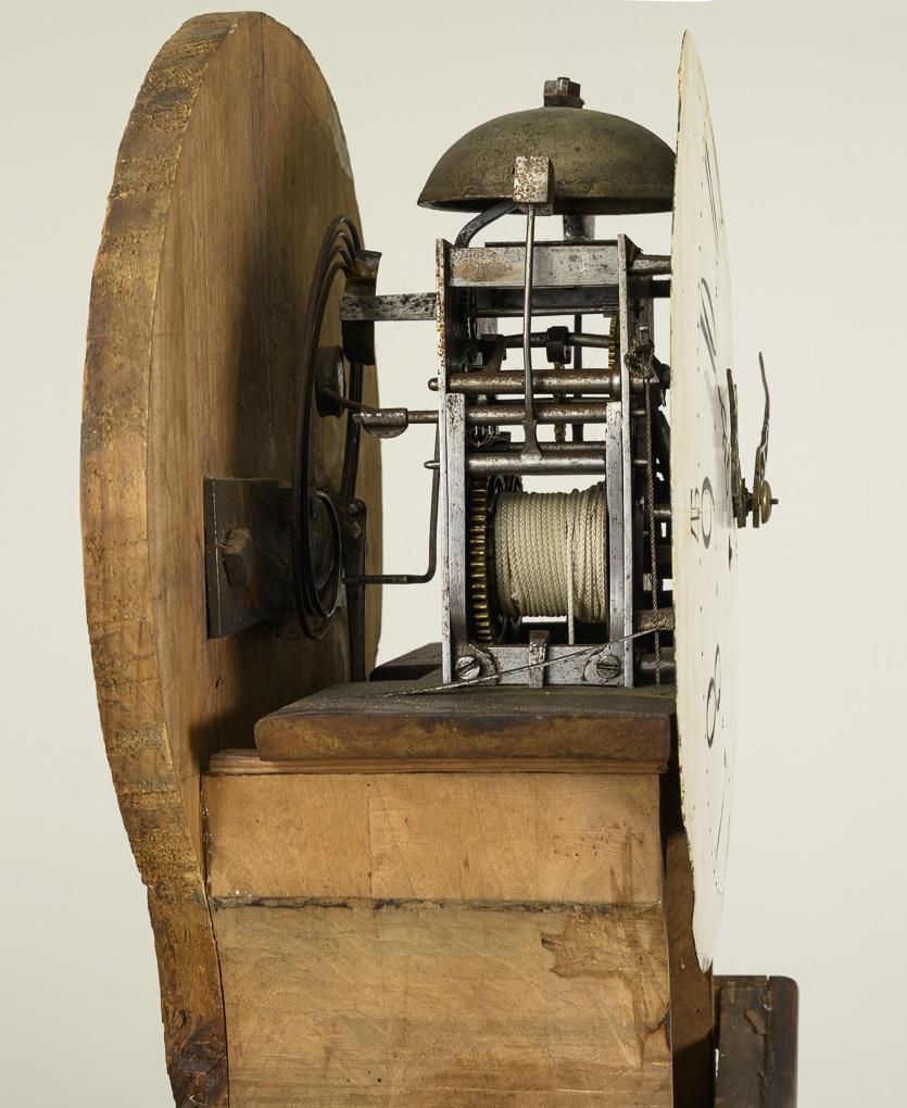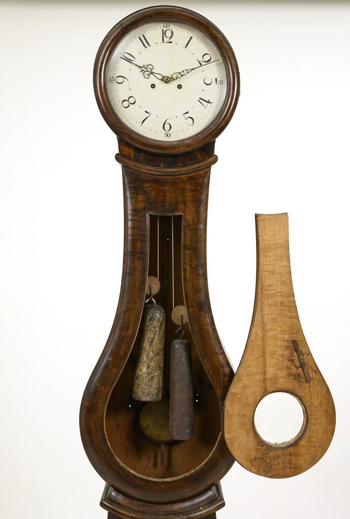 Round-headed case with lyre-shaped pendulum case and bulged base. Signs of age and use, partial defects, inactive anobia attack.