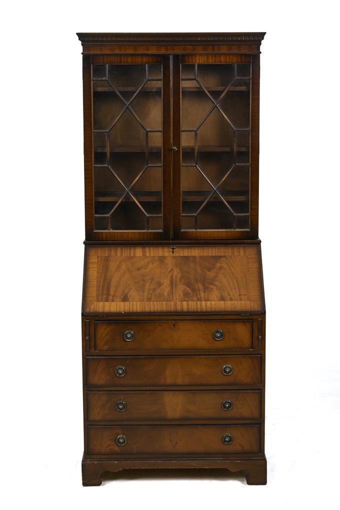 Slim display cabinet top secretary with 4-tray chest of drawers bottom, middle secretary part with slanted flap and laterally pull out supports and 2-door display cabinet top with decorative sprouted glass; secretary part 2 small drawers and quite a few open shelves, writing surface with green leather cover, top inside with 3 shelves. Slight signs of age / use, veneer somewhat dry cracked.