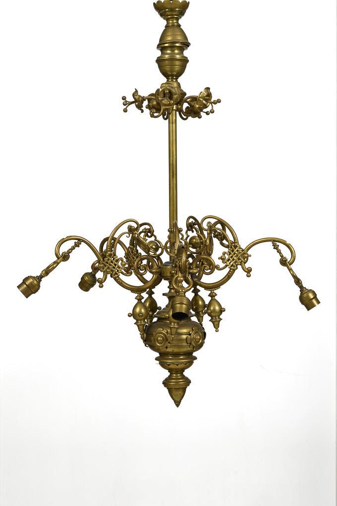 5-flame hanging lamp in the style of a Flemish ceiling crown, on central strut with baluster suspension and lamp arms made of compound C-curves, richly decorated with applications. Signs of age/use.