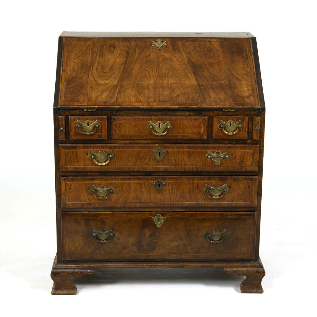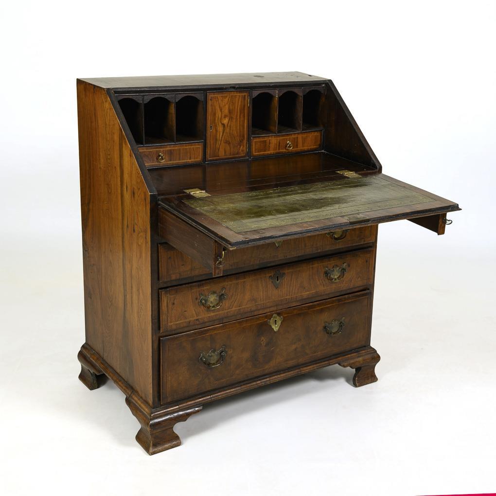 Secretary with beveled writing flap on dresser base with 3 large drawers and medium drawer flanked by 2 small drawers; writing part inside with 2 drawers, 6 open shelves and 1 lockable compartment, writing top with green leather cover and gold embossing, underneath on the sides pull-out supports. Signs of age/use, dry cracks.