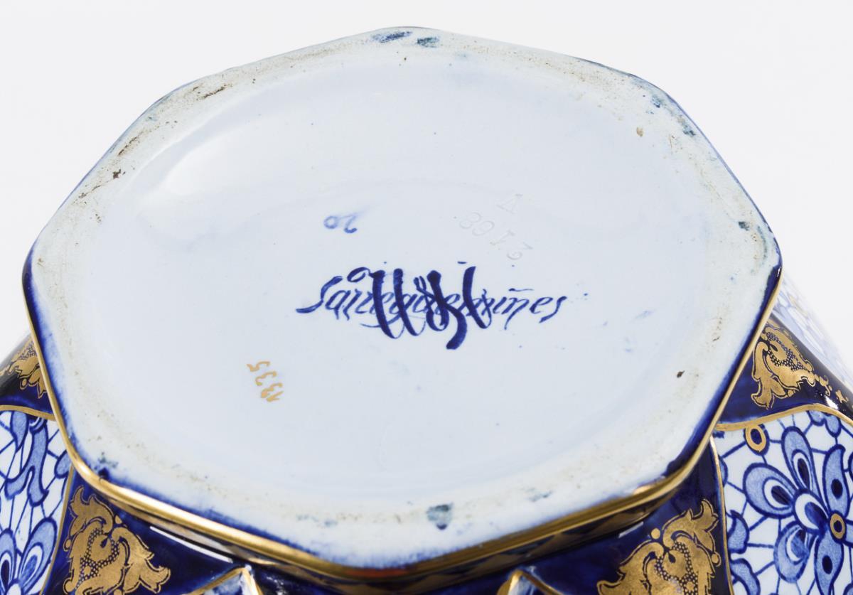 Faience, paste blue glaze, cobalt blue floral decoration, gold trim. H 45 cm.