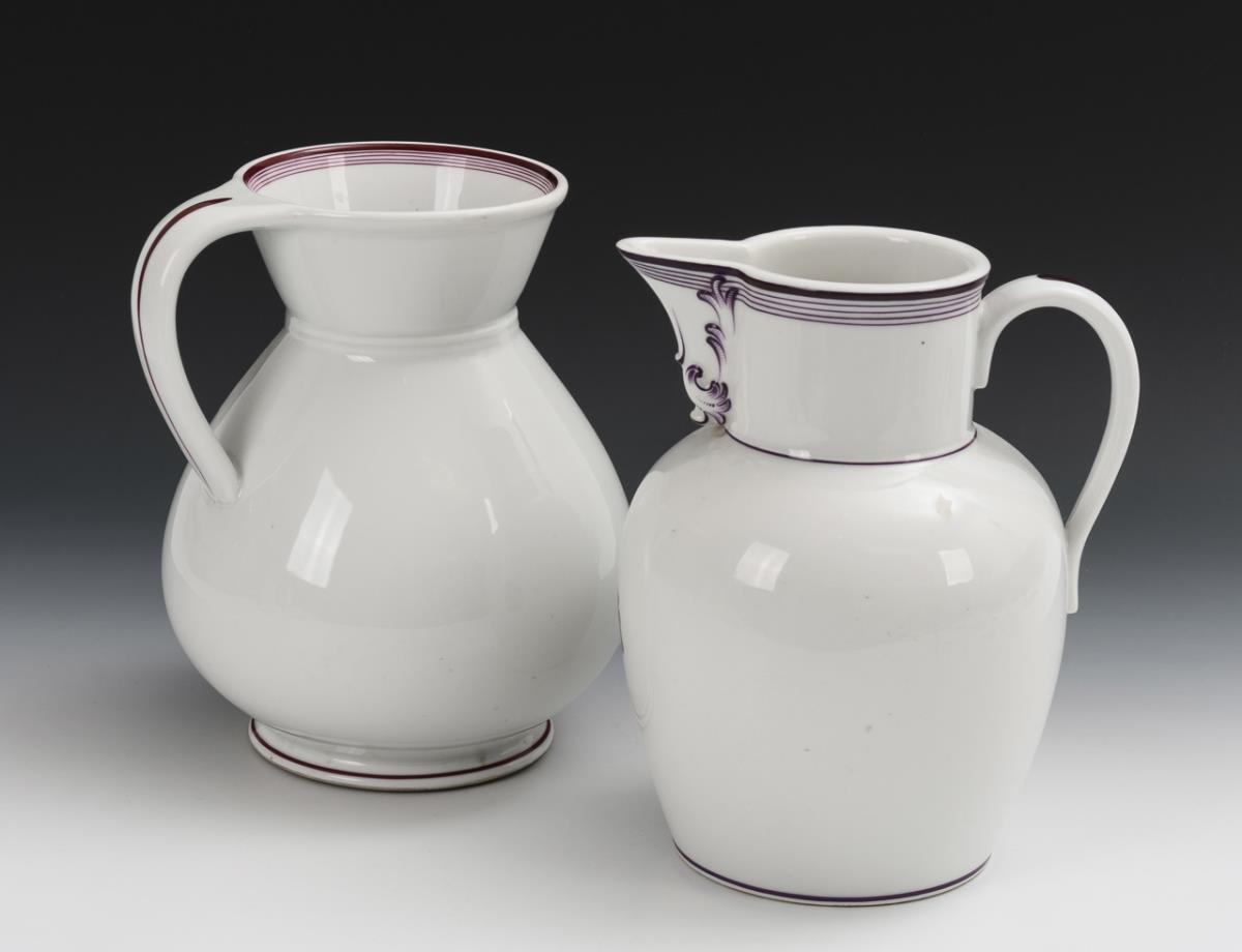 1x Gotha, Hennenmarke, 1860-ca. 1883: water jug with violet painted staffage as well as the representation of the Saxon coat of arms on the front. / 1x Hutschenreuther mint mark, 1873-1910: water jug with purple painted staffage as well as the on the outside crowned monogram "A".