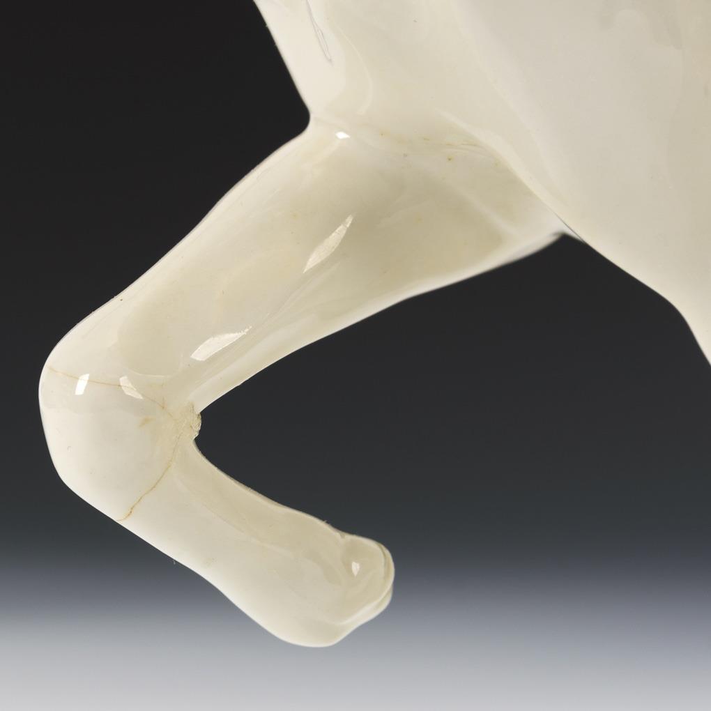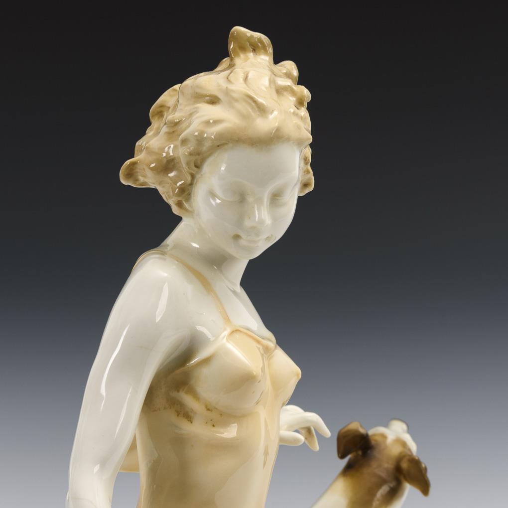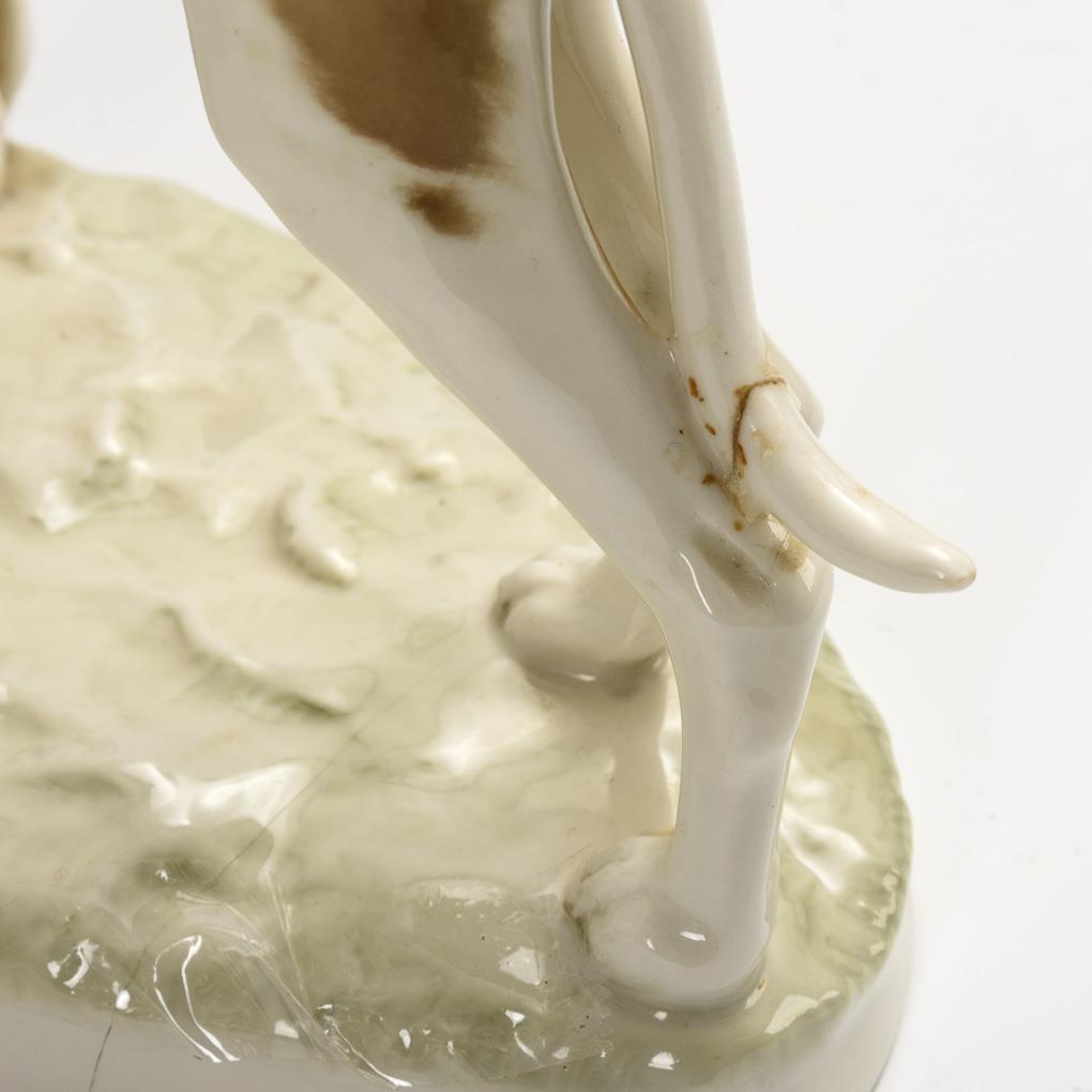 Above a natural base running young woman with two greyhounds. Partial hairline cracks in the glaze, dog's tail and left hand of the woman glued, 2 hairline cracks in the base.