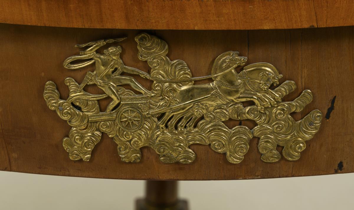 Round salon table on 3 columns with three-passage base, decorated with figural brass applications of Greco-Roman mythology to "Apollo and the Muses". Signs of age/use, veneer with defects.
