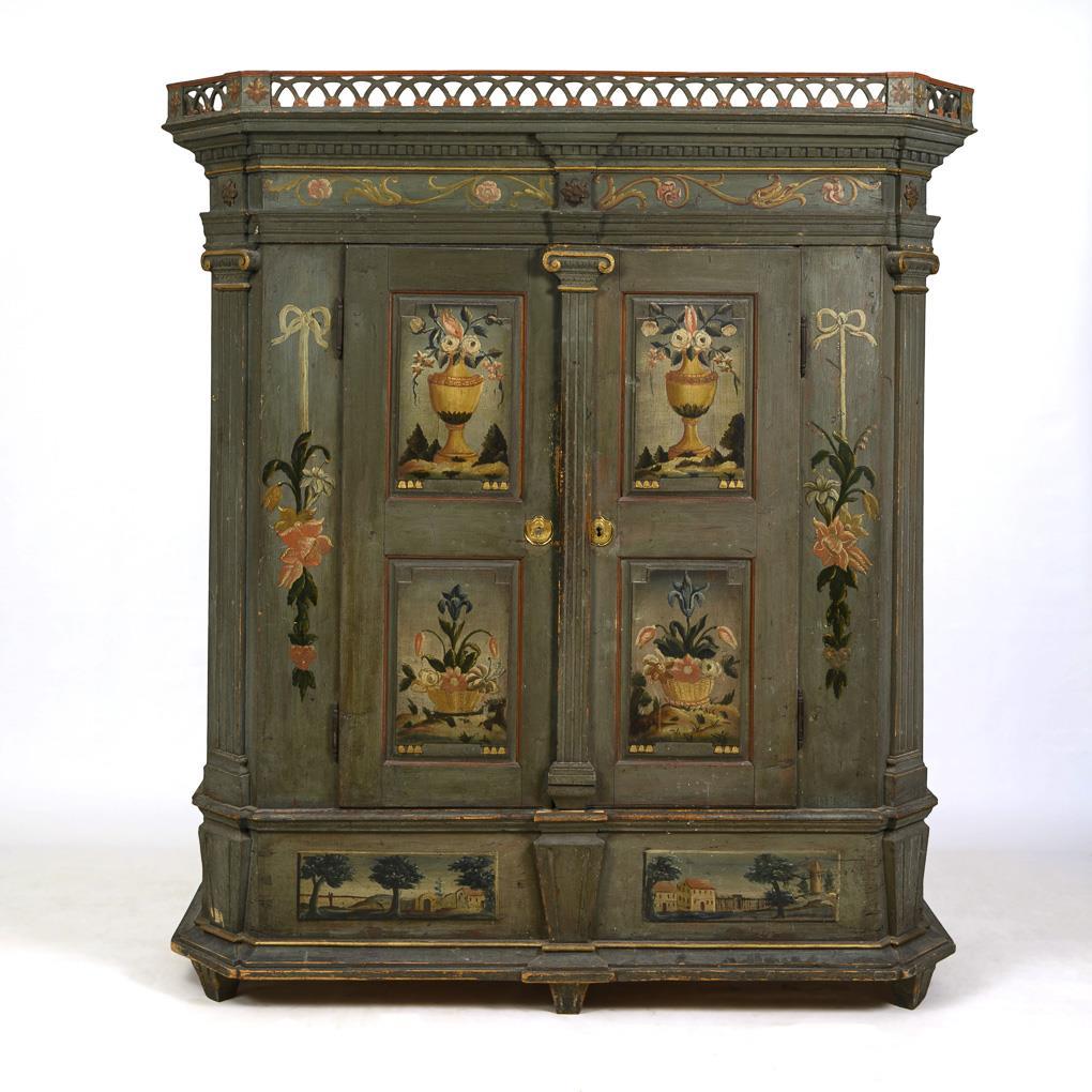 Blue-framed, 2-door plank cabinet, cornice with balustrade, decorated with Ionic columns, polychrome painted with bows, floral vines, landscapes and amphorae; inside with several coat hooks; bracket handles on the sides at the base. Marks of age/use, dry cracks, inactive anobia attack.