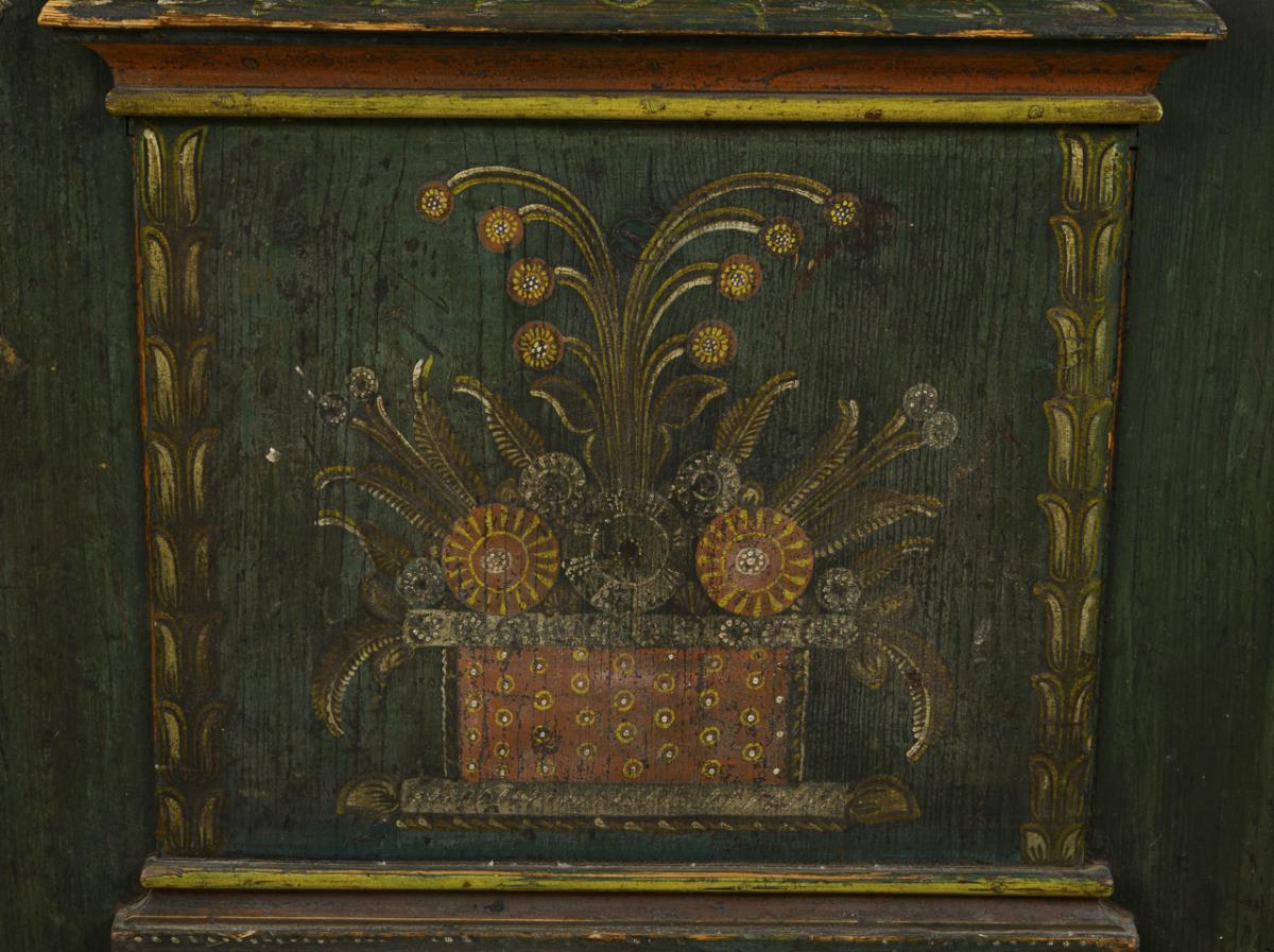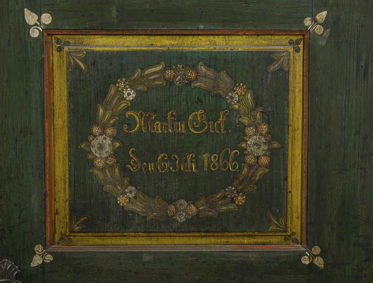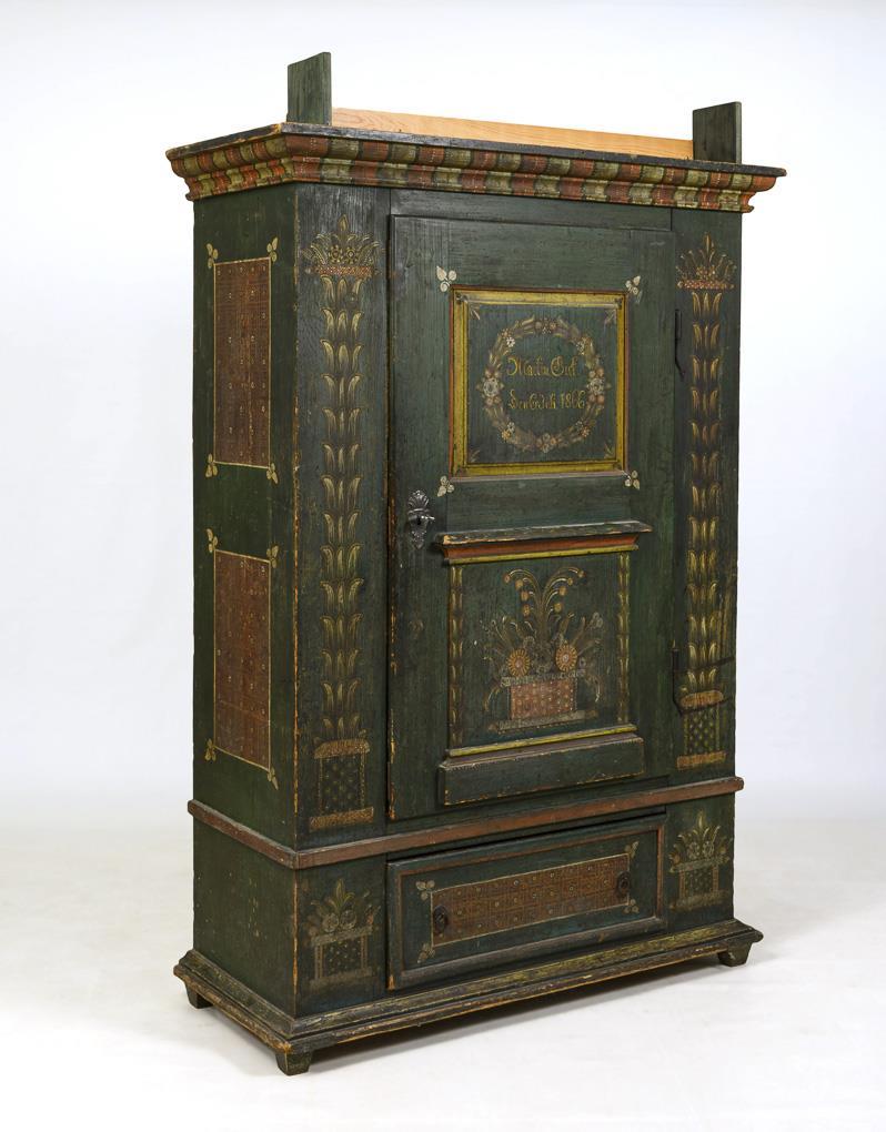 1-door hall cabinet of board construction, with straight cornice, supplemented top as an open storage space and plinth drawer; green painted and polychrome painted with Corinthian columns, floral motifs and fabrics, inscribed "Martin Sick. den 6. Juli 1866". Traces of age / use, dry cracks, trim missing.