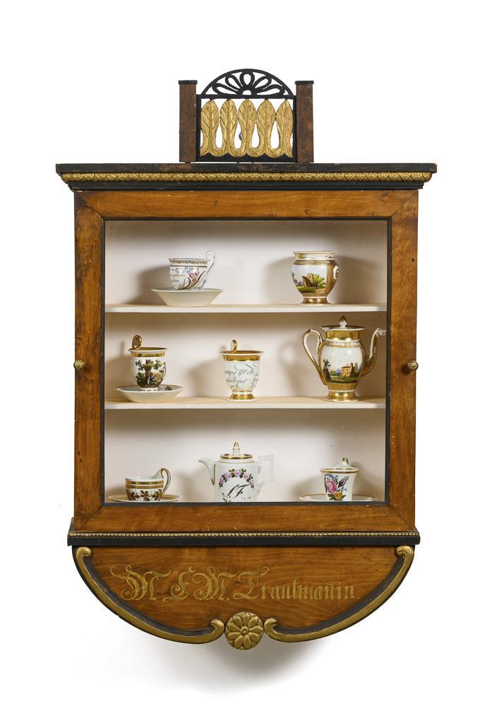 Small hanging cabinet with removable glazed front, decorated with classicist ornaments of bead and palmette carvings, crowned with architectural structured acanthus leaf carving, suspended curved frame with inscription "W.S.M. Trautmannin."; inside younger inserted frame with 2 shelves; as an addition various defective view porcelains. Traces of age / use, old restored.