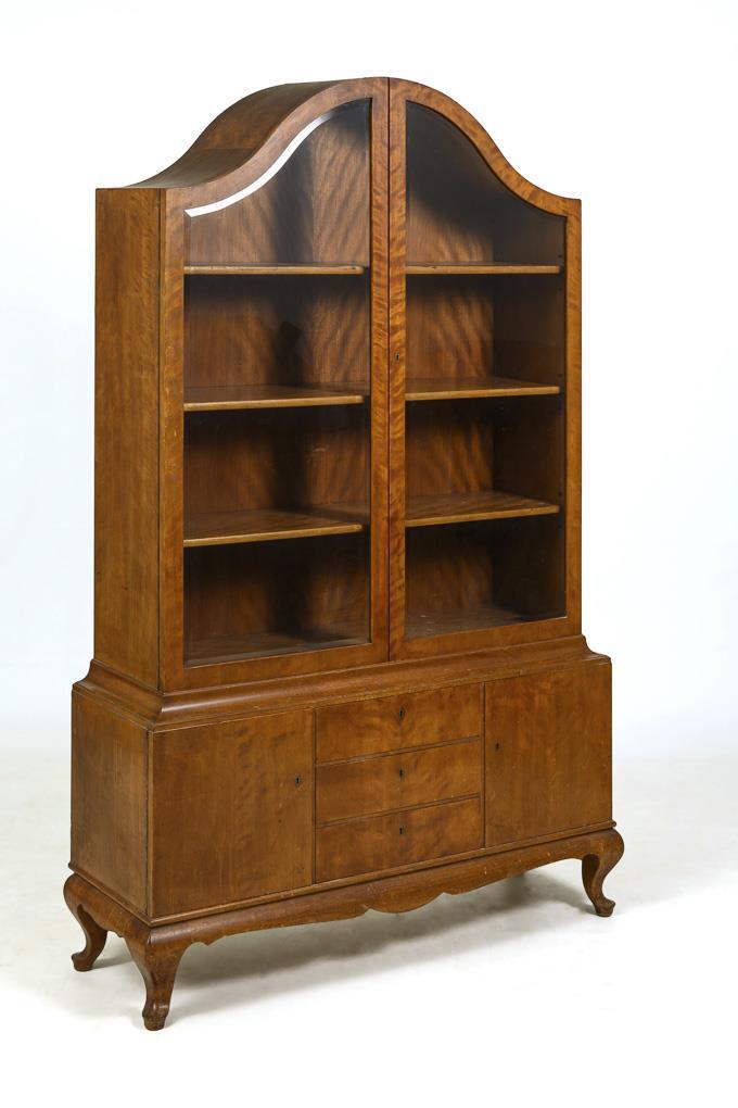 2-door display cabinet attachment with curved pediment, on box-shaped base with central 3 drawers and 2 flanking doors, on flared feet; attachment inside with 3 shelves, base with 1 shelf each. Traces of age/use.