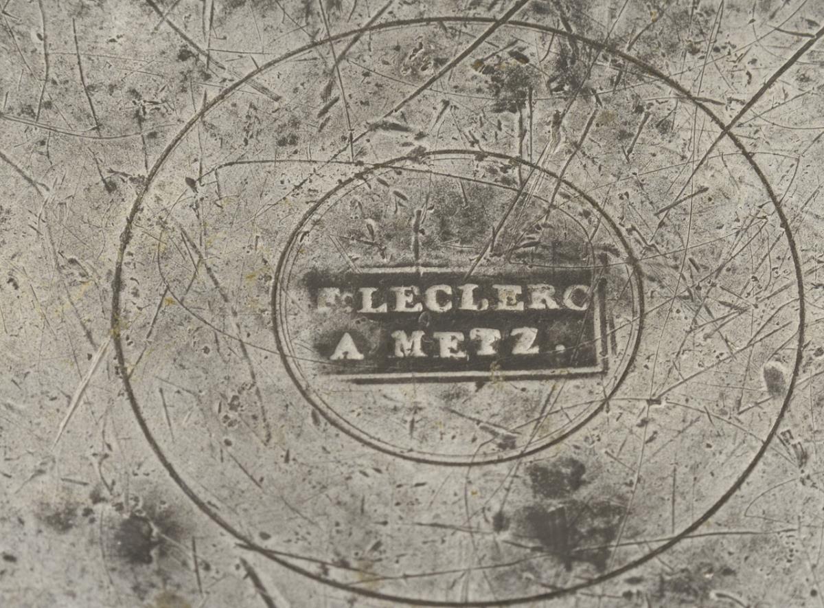 2 candlesticks, including 1 baroque silver type or engraved "JTG 1820". 3 spice bowls, including 1 baroque saliere with curved feet and 1x with engraving "CR 1834". "Leclerc Metz" marked jug with dragon heads on the handle. Godroned bowl. Partly heavier signs of age/use.