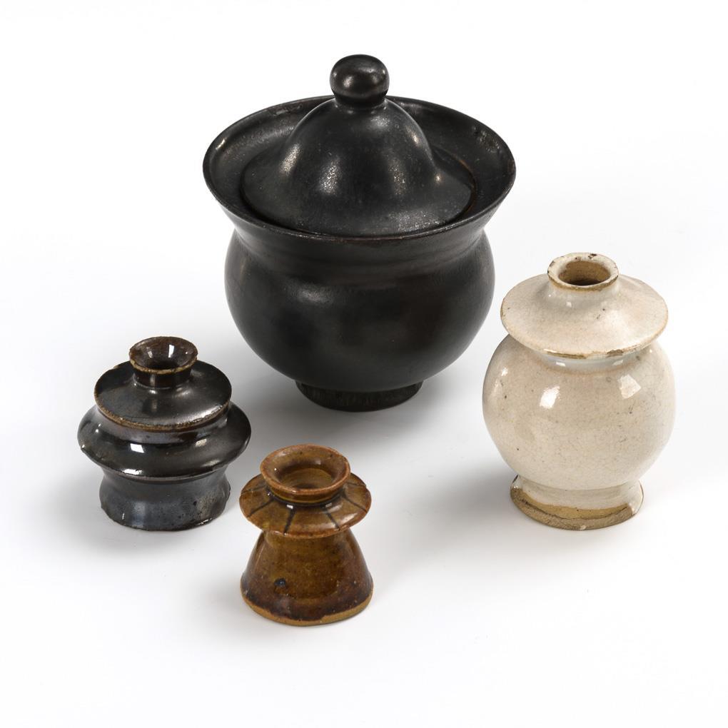 Lidded vessel and 3 small candlesticks. Partially minimally bumped, lid rim restored.