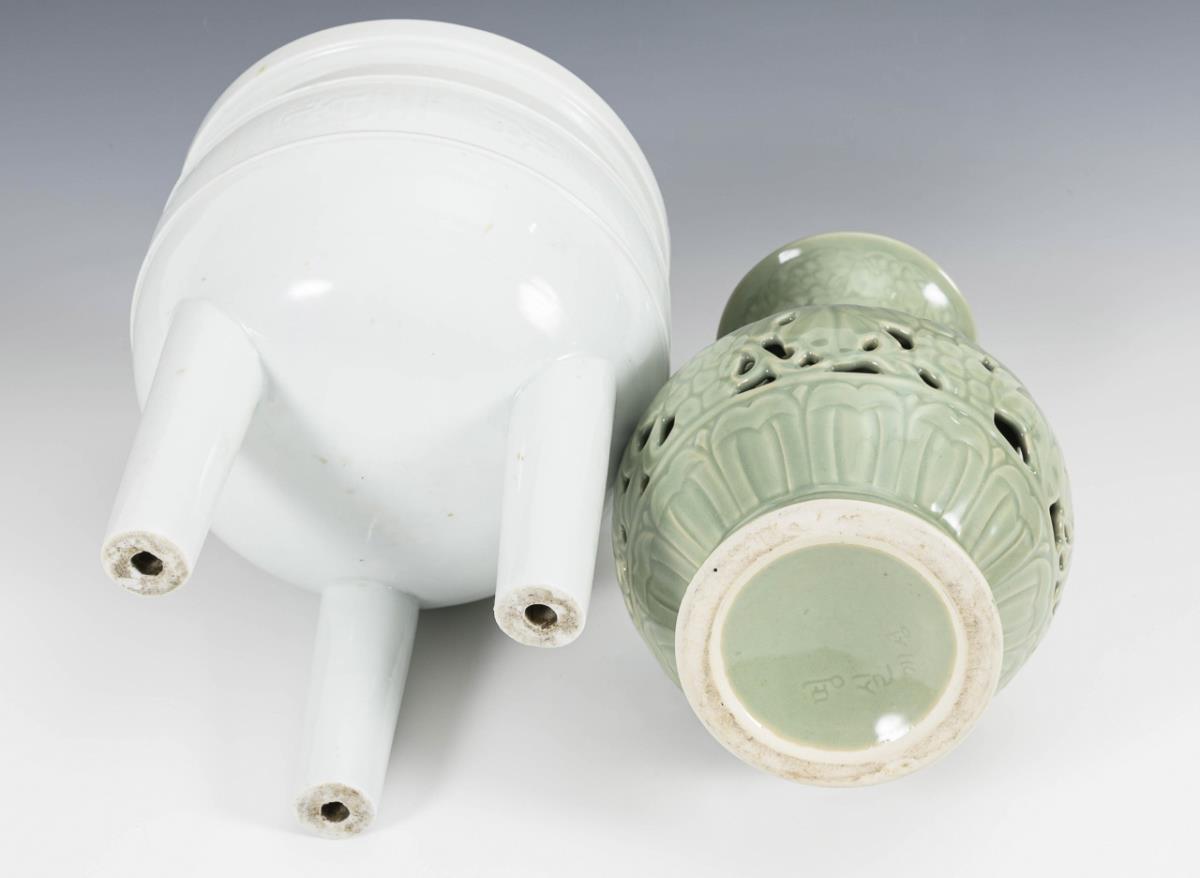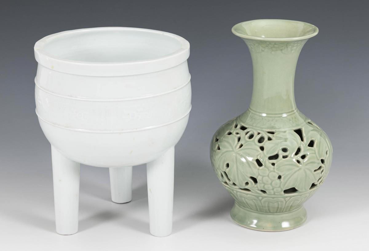 Double-walled vase with celadon glaze and three-legged vessel.