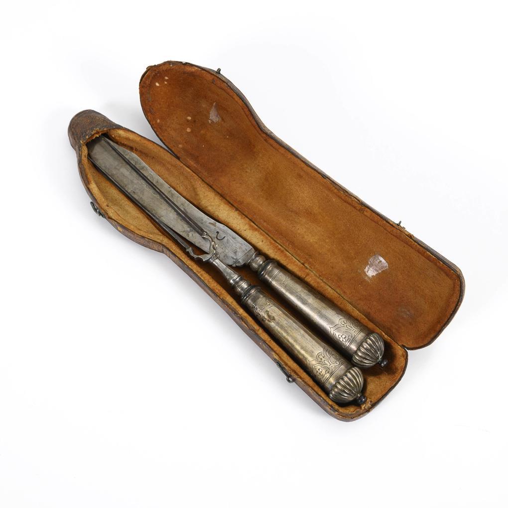 2-piece cutlery set with floral engraved silver handles. In original brown case with gold embossing. Signs of age, spoon missing.