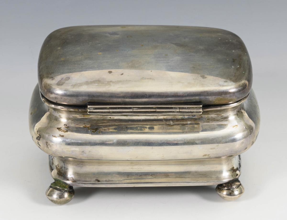 Bellied, lockable sugar box. On pressed ball feet. Signs of use, lock jammed.