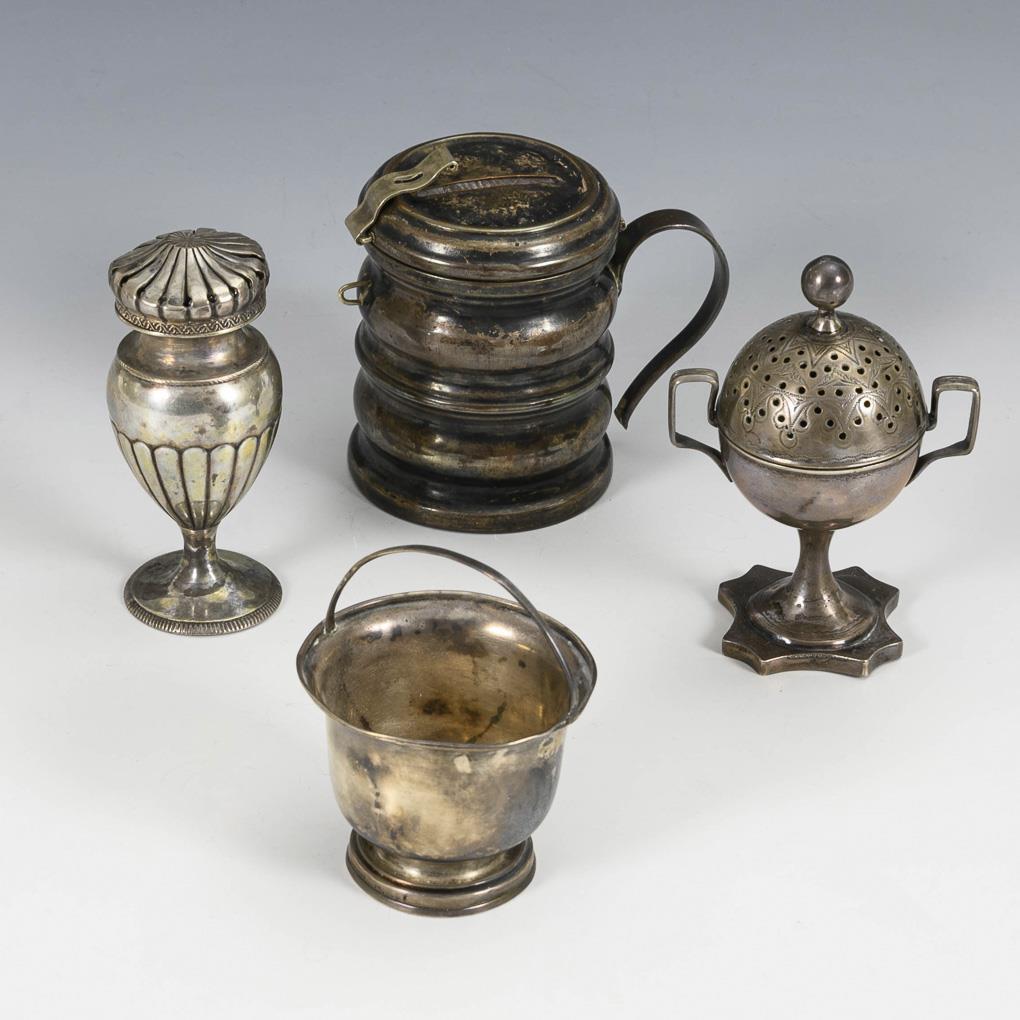 Collecting box, small bowl with handle and 2 shakers. Signs of age, small defects and solder joints.